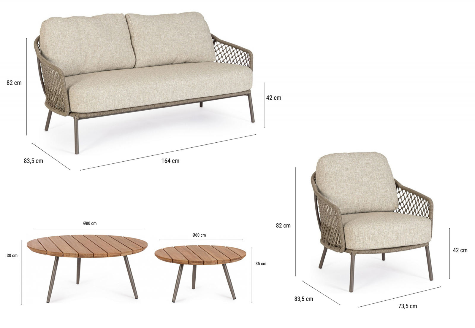 Комплект лаунж мебели Corbeta - это современная комбинация мебели интересной формы и приятного цвета, благодаря которому она оживит любое пространство, в котором находится. Комплект привлекает внимание и станет прекрасным дополнением гостиной зоны на открытом пространстве. Каркас изготовлен из стали и имеет мягкие подушки на сиденье и спинке. Подлокотники и продуманная конструкция гарантируют комфорт во время использования. Плетеный корпус придает дивану и креслам удивительный характер. Ножки обеспечивают хорошую устойчивость.