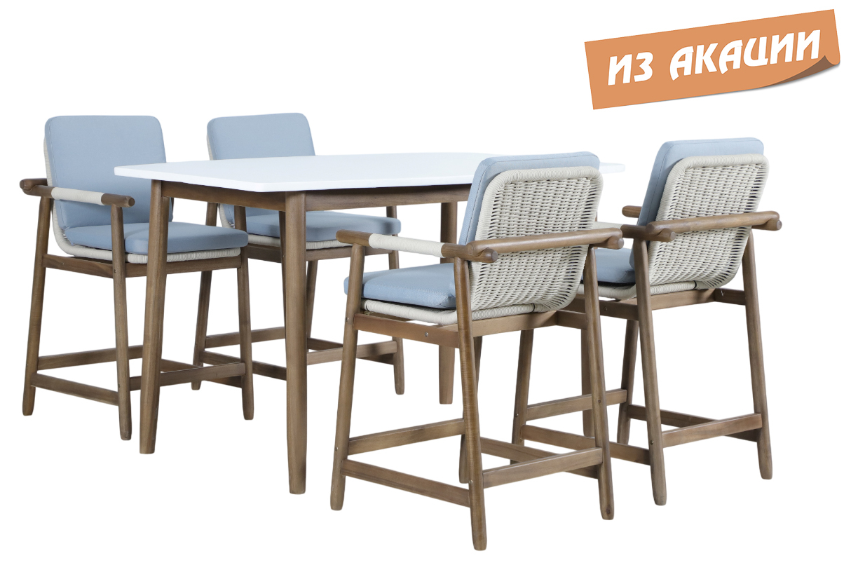 Барная группа Apoyo на 4 персоны - это стильная коллекция уличной мебели из массива АКАЦИИ, в которой сочетаются натуральное верёвочное (роуп) плетение, тёплая текстура дерева и комфортные подушки. Комплект барной мебели состоит из четырех полубарных комфортных кресел и барного стола. Превосходное решение для террасы или веранды, подходящее для тех, кто ценит долговечность и эстетический вид уличной мебели.