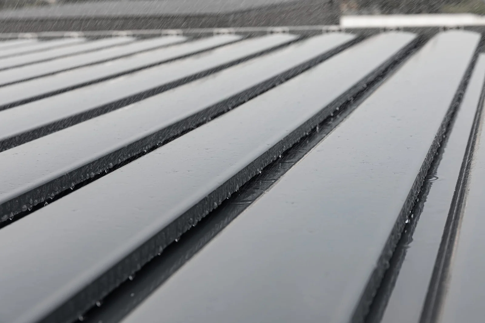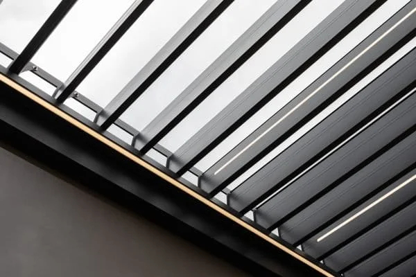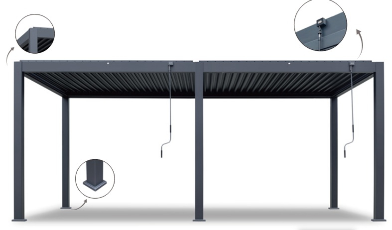Алюминиевые верхние жалюзи с регулировкой угла наклона управляются с помощью двух ручных рукояток, позволяя без усилий контролировать уровень освещенности и тени. Линейный, минималистичный профиль перголы гармонично вписывается в современные архитектурные решения, подчеркивая стиль любого outdoor-пространства.
