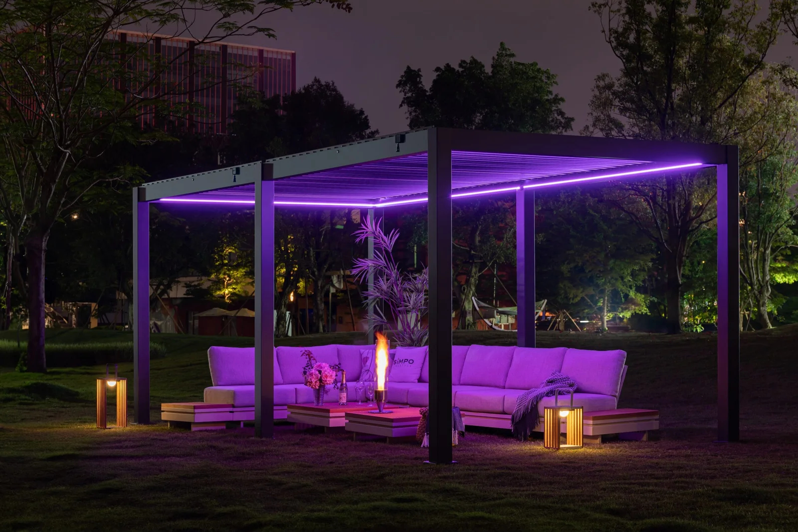 Пергола Astrol Pergola размером 3x6 м оснащена внешней рукояткой и многоцветными светодиодами.