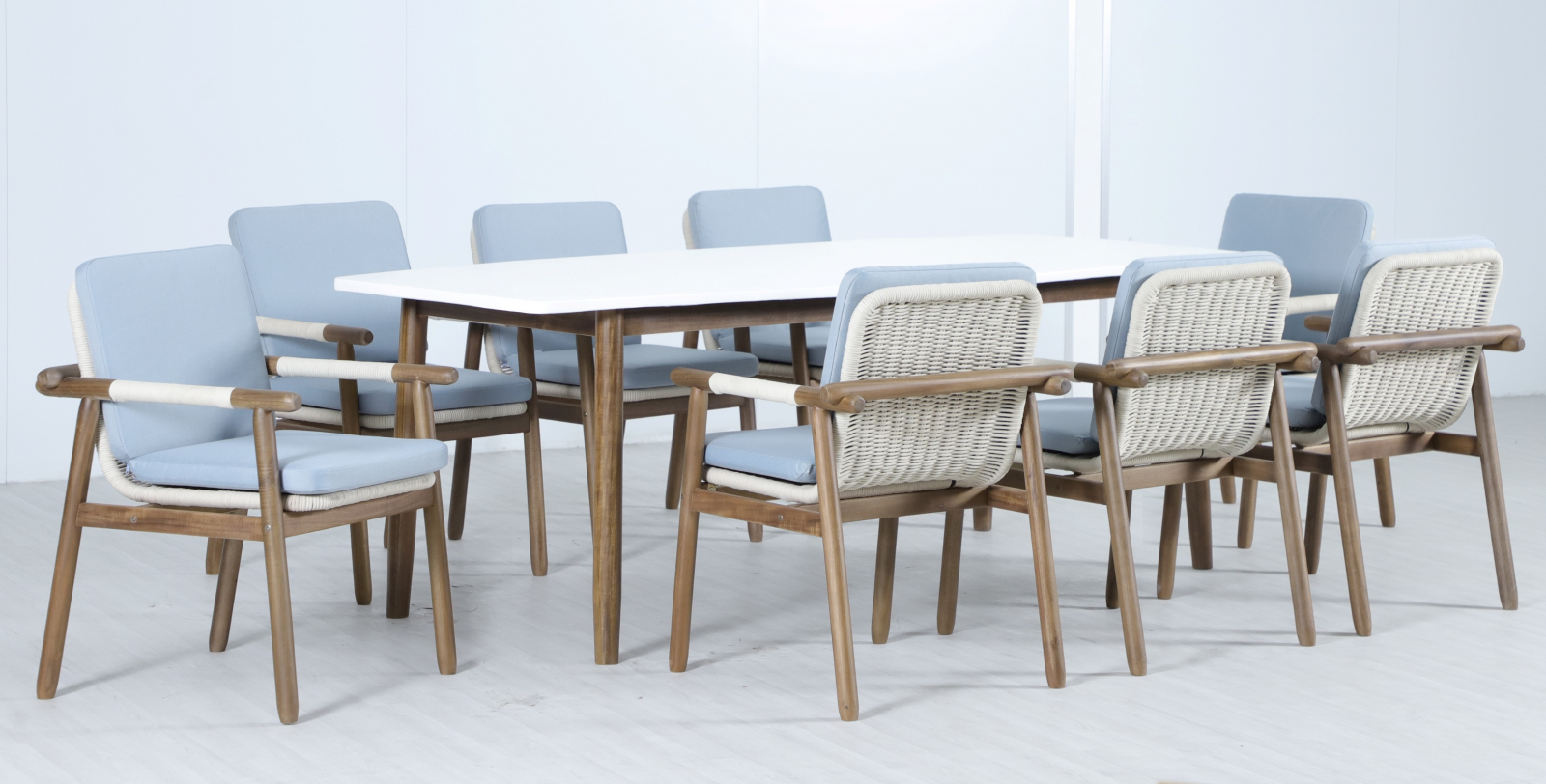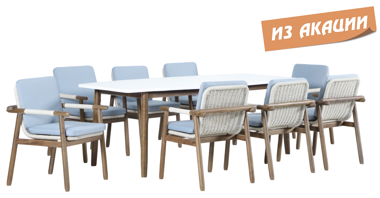 Обеденная группа Apoyo на 8 персон - это стильная коллекция уличной мебели из массива АКАЦИИ, в которой сочетаются натуральное верёвочное (роуп) плетение, тёплая текстура дерева и комфортные подушки. Превосходное решение для террасы или веранды, подходящее для тех, кто ценит долговечность и эстетический вид уличной мебели.