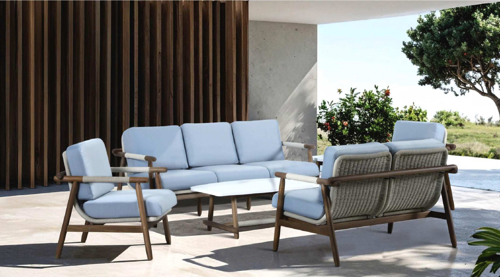 Apoyo - это стильная коллекция уличной мебели из массива АКАЦИИ, в которой сочетаются натуральное верёвочное (роуп) плетение, тёплая текстура дерева и комфортные подушки. Комплект для отдыха состоит из двухместного и трехместного диванов, двух комфортных кресел, двух журнальных столиков. Превосходное решение для террасы или веранды, подходящее для тех, кто ценит долговечность и эстетический вид уличной мебели