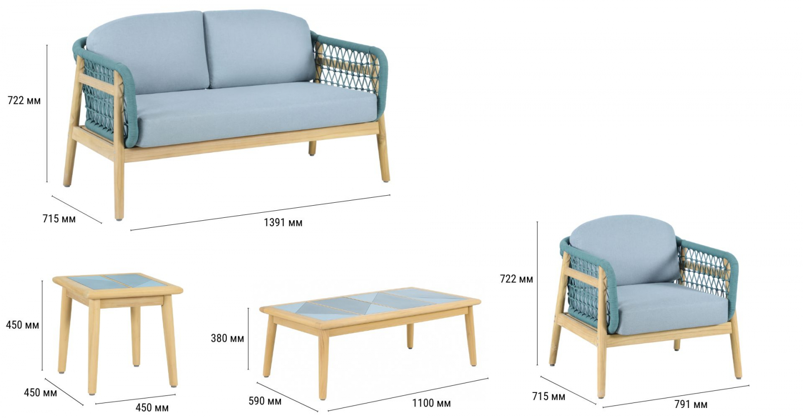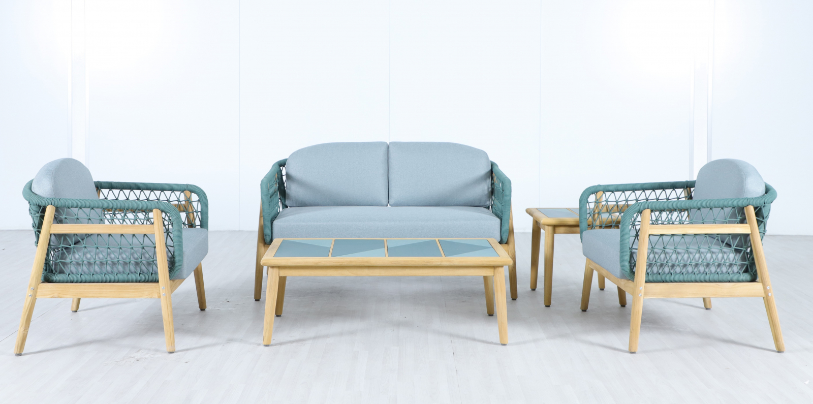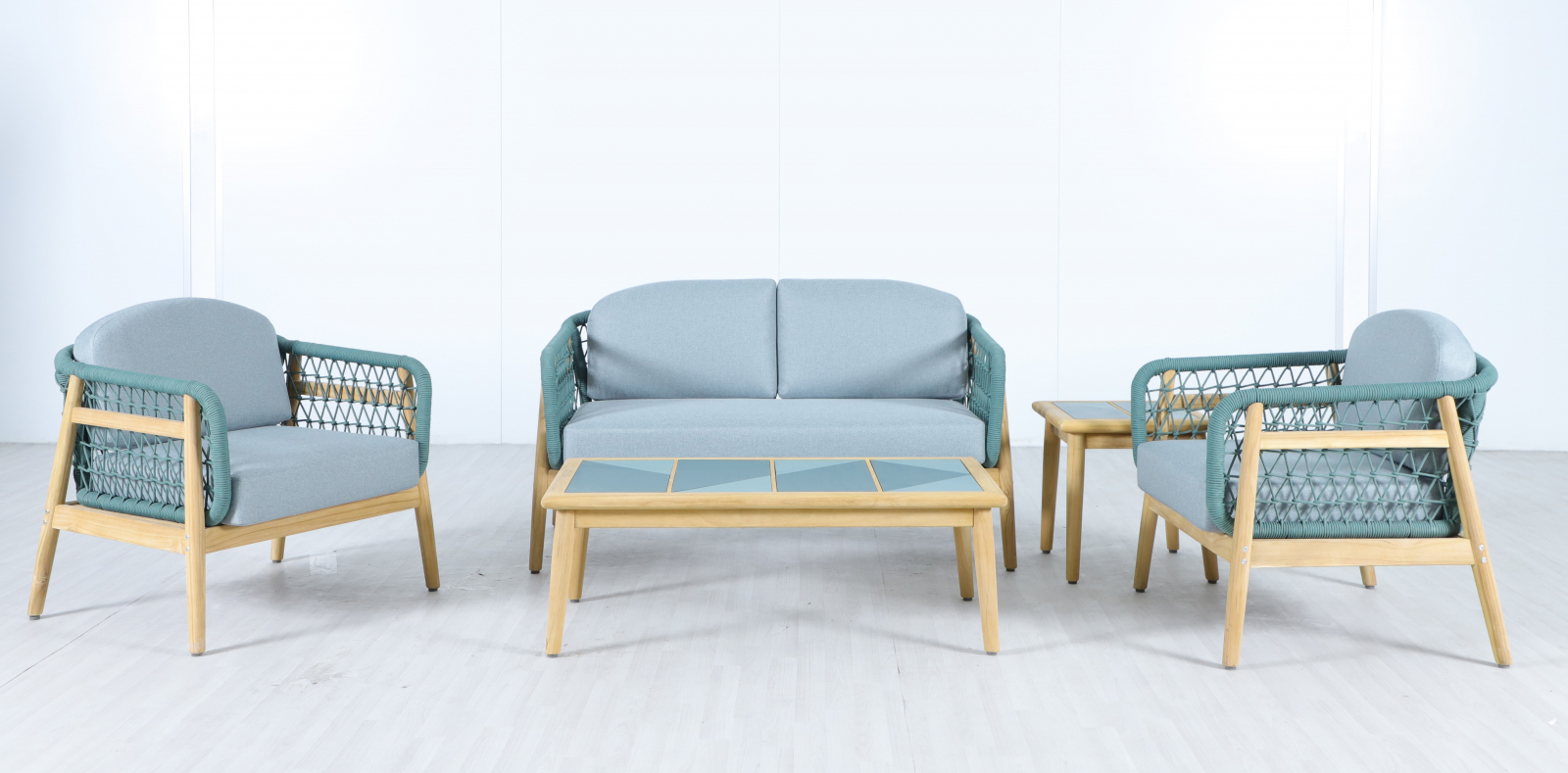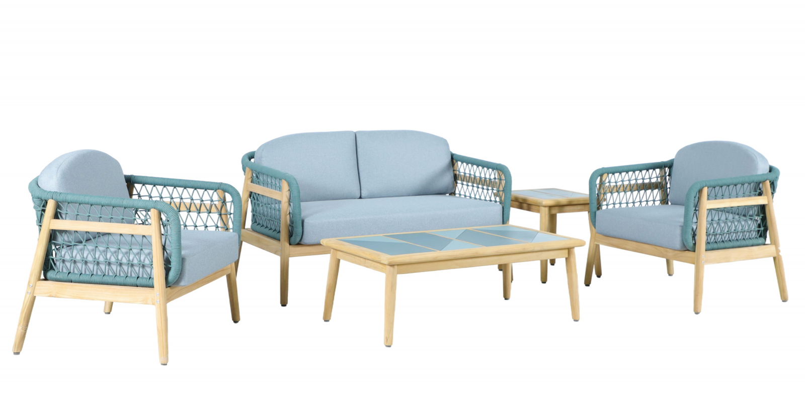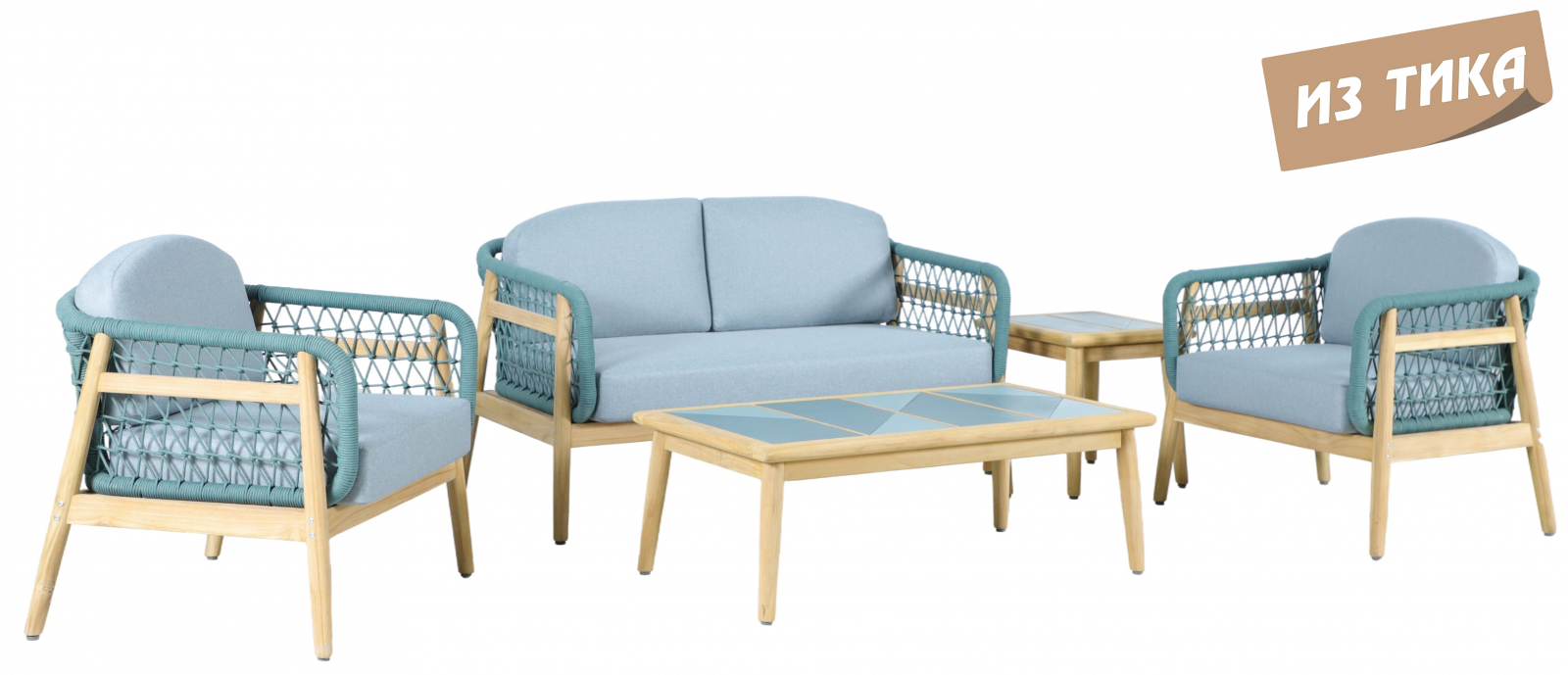 Cambria - это современная серия уличной мебели, объединяющая натуральную тёплую текстуру ТИКА, верёвочное плетение роуп и комфортные съёмные подушки. Комплект для отдыха состоит из двухместного дивана, двух комфортных кресел и двух журнальных столиков. Коллекция разработана для открытых пространств - террас, веранд и садовых зон отдыха и ориентирована на тех, кто ценит долговечность, премиальный вид и минимальный уход.