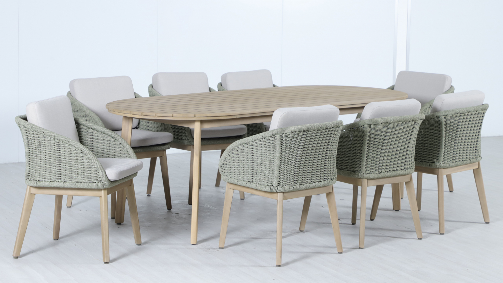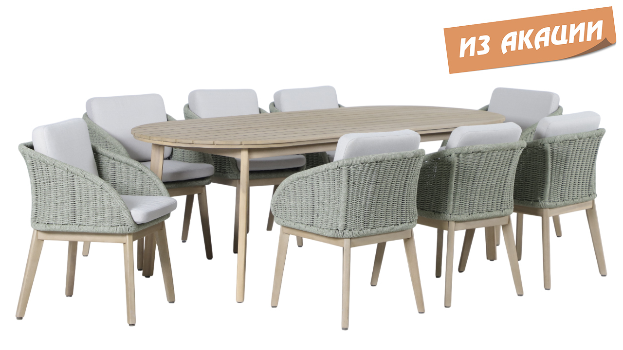 Обеденная группа Madrague на 8 персон - это элегантная коллекция уличной мебели из АКАЦИИ, выполненная в комбинации веревочного плетения роуп, акации и комплектом устойчивых к погоде подушек. Идеальна для террасы, веранды или комфортной зоны на открытом воздухе - сочетает эстетичный внешний вид, прочность и простой уход.