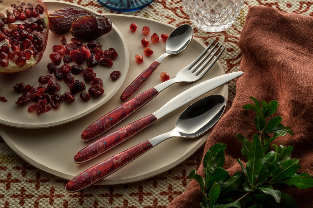 Коллекция столовых приборов с культовым дизайном, характеризующимся строгим минимализмом. Декор, выполненный методом непрямой сублимационной печати, напоминает узоры изразцов, украшающих мечети, минареты, купола и мавзолеи Самарканда и всего Узбекистана. Каждое священное сооружение имеет свою неповторимую деталь, каждое из которых представляет собой шедевр мозаики и изразцов с цветочным орнаментом. Самарканд расположен на Великом шелковом пути - древнем торговом пути, соединявшем Китай со Средиземноморьем.