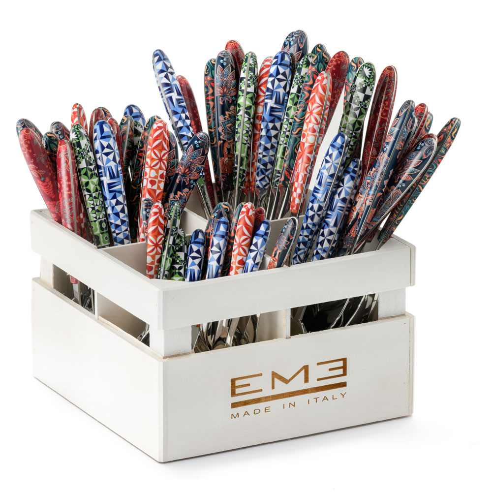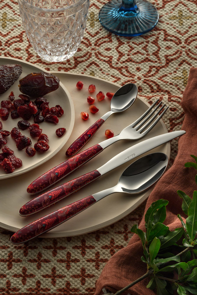 Vero Samarcanda - это коллекция столовых приборов из нержавеющей стали 18/0 с полированной отделкой и ручками из ПБТ, изготовленными методом ультразвуковой сварки.