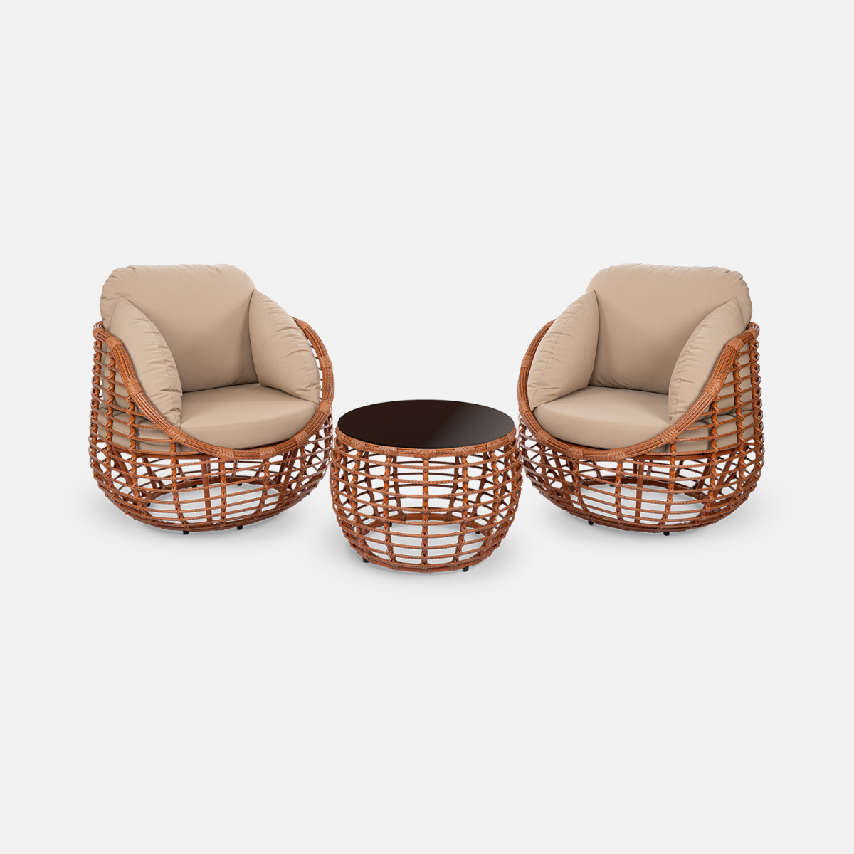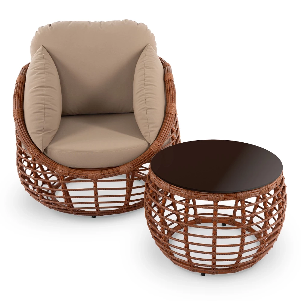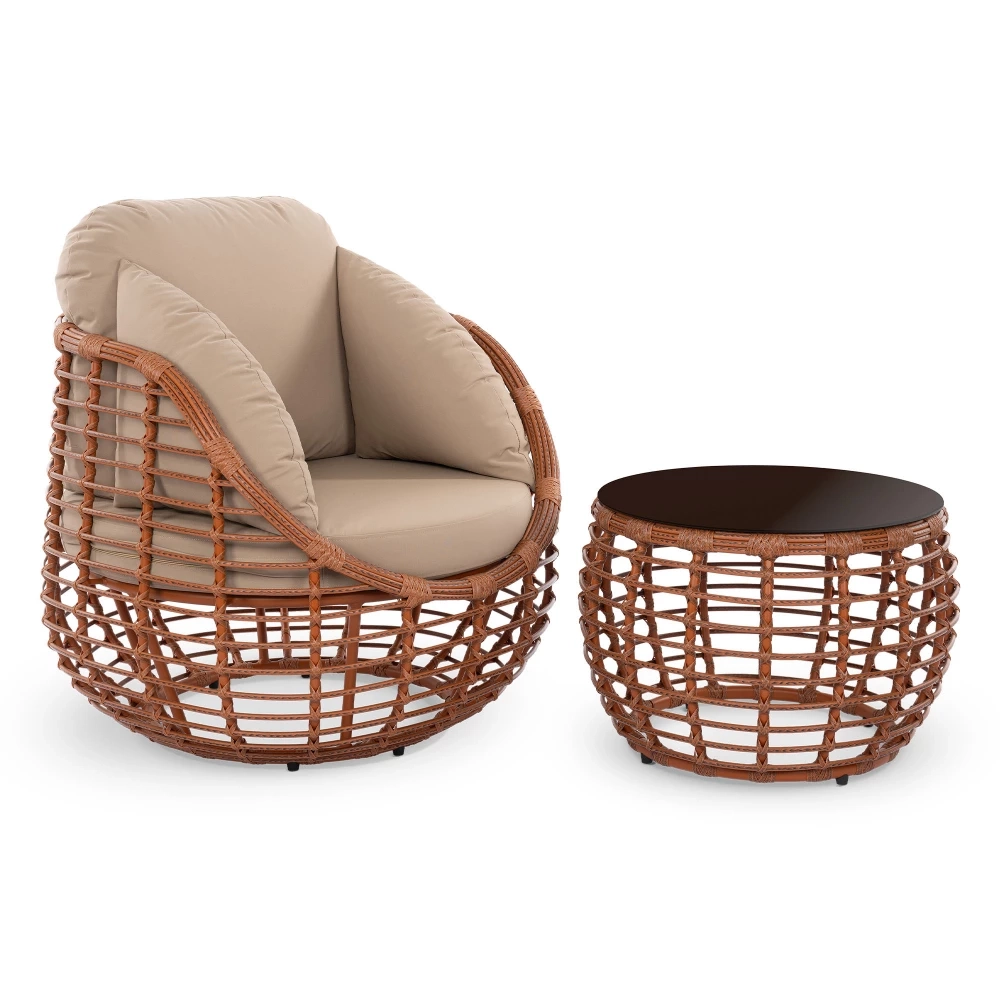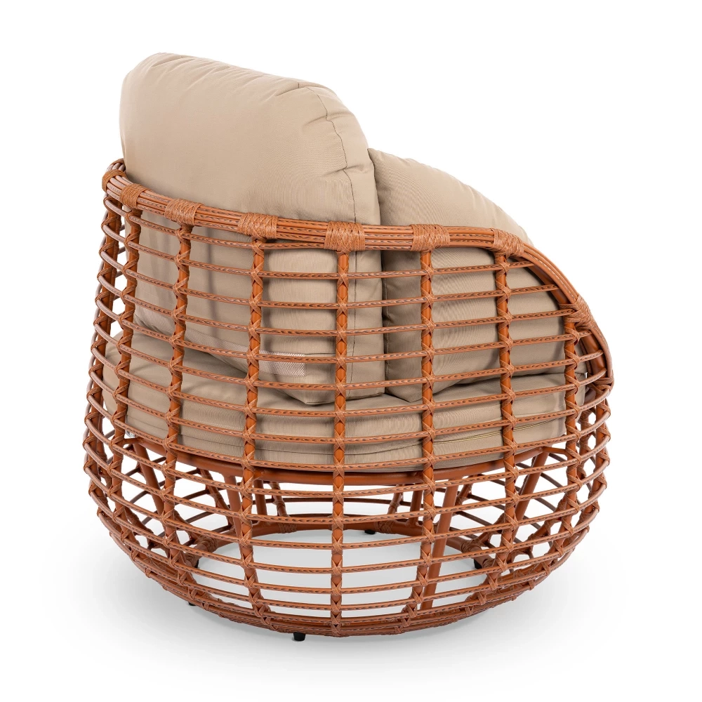 Эргономика кресла обеспечивает комфорт: спинка и подлокотники образуют единую чашу, мягко поддерживающую корпус. Материалы подобраны для долговечности: ротанг не выцветает на солнце, а каркас с порошковой окраской защищён от коррозии. Модель органично вписывается в частные террасы, зоны у бассейна и коммерческие пространства. Преимущества коллекции: глубокая посадка с полной поддержкой спины, устойчивость к влаге и ультрафиолету, простой уход без специальных средств.