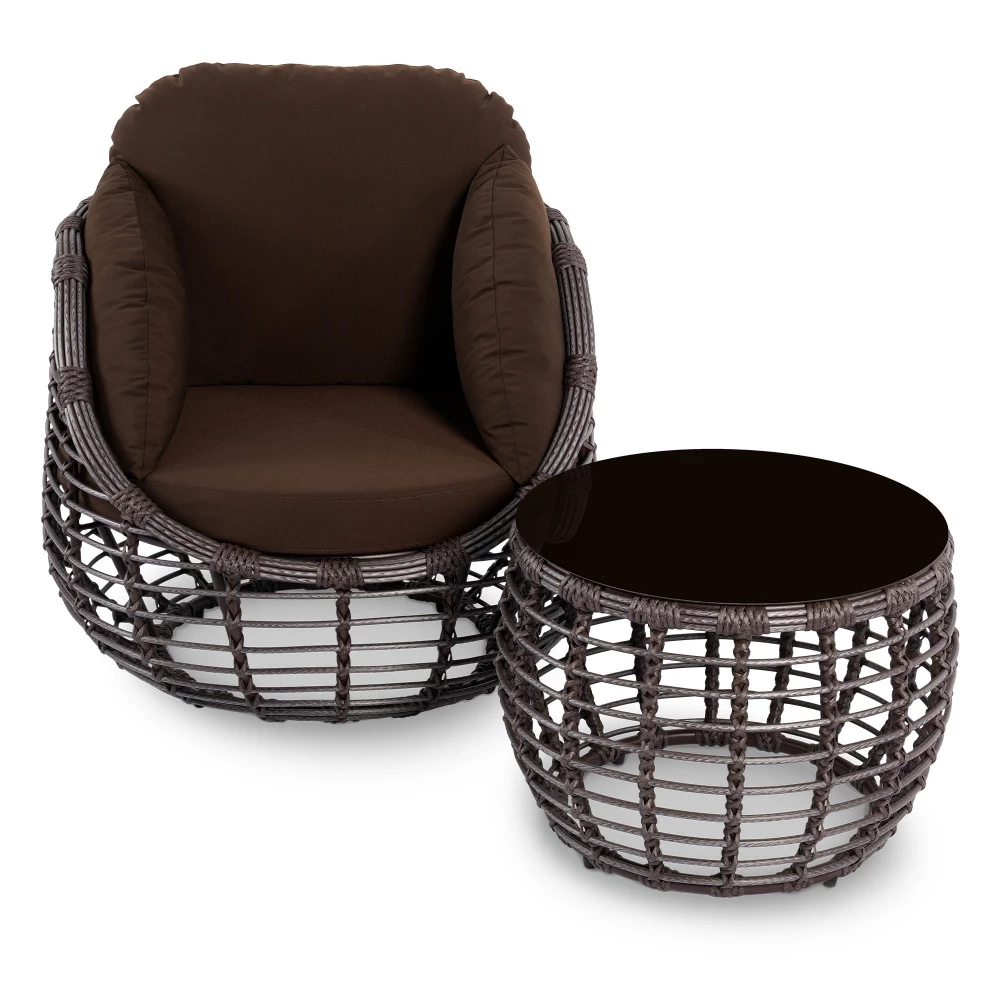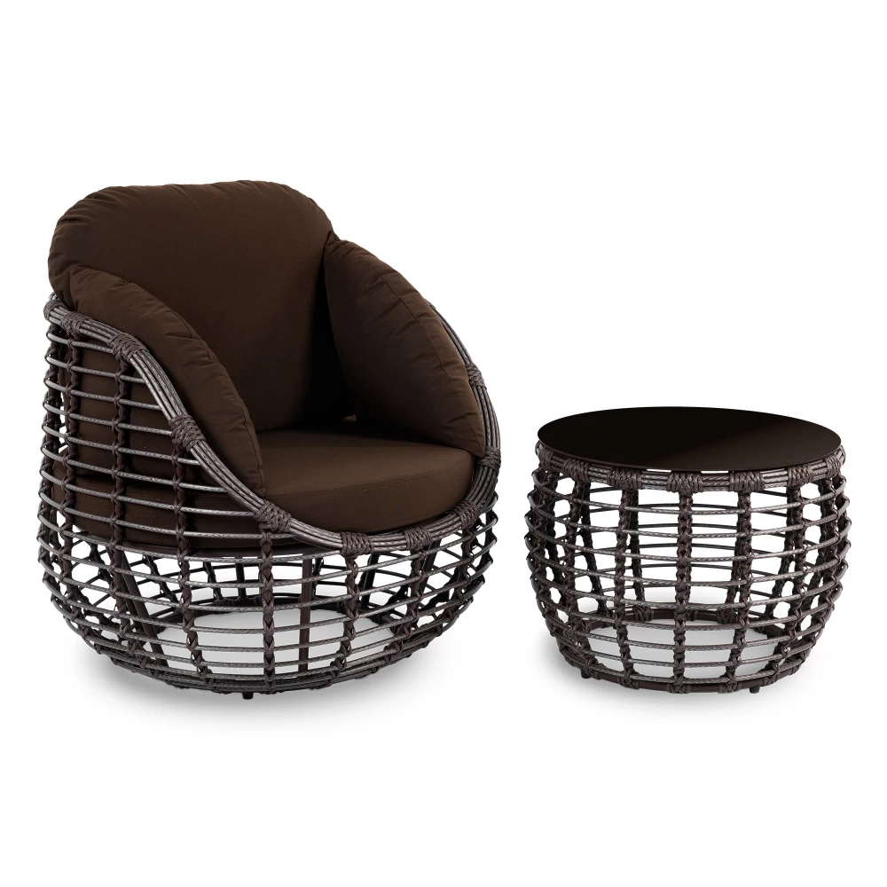 Эргономика кресла обеспечивает комфорт: спинка и подлокотники образуют единую чашу, мягко поддерживающую корпус. Материалы подобраны для долговечности: ротанг не выцветает на солнце, а каркас с порошковой окраской защищён от коррозии. Модель органично вписывается в частные террасы, зоны у бассейна и коммерческие пространства. Преимущества коллекции: глубокая посадка с полной поддержкой спины, устойчивость к влаге и ультрафиолету, простой уход без специальных средств.