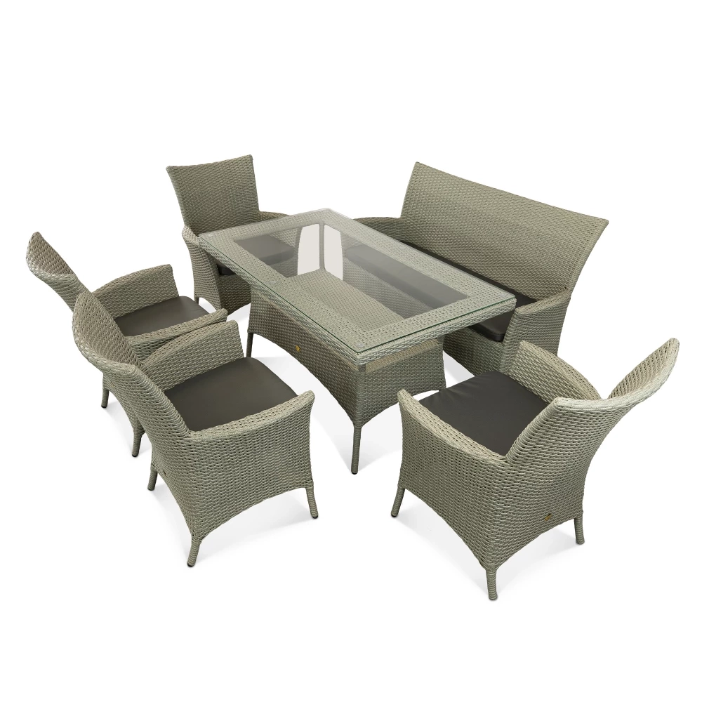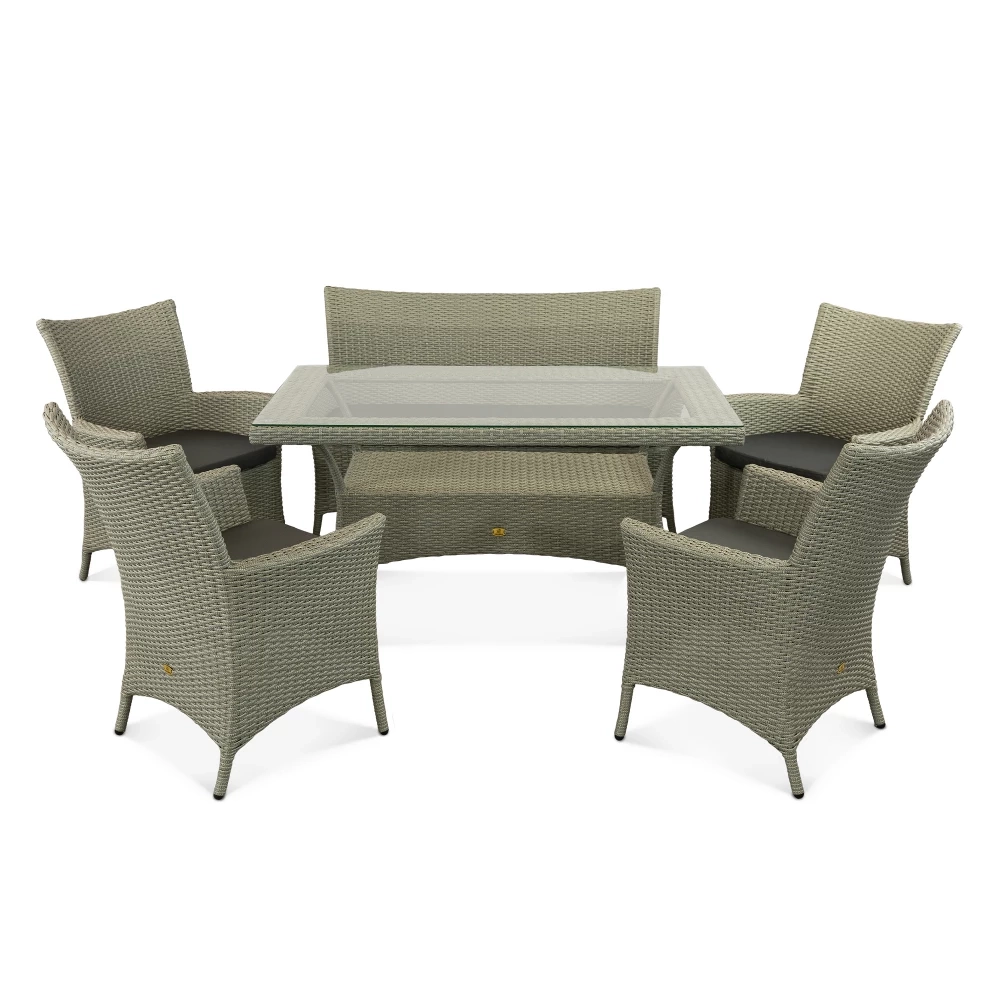 Стол Kipr прямоугольной формы рассчитан на комфортное размещение шести персон. Его прочная основа - цельносварной алюминиевый каркас с износостойким порошковым покрытием, дополненный долговечным плетением из искусственного ротанга. Практичная столешница из закаленного стекла легко вписывается в любой интерьер и неприхотлива в уходе.