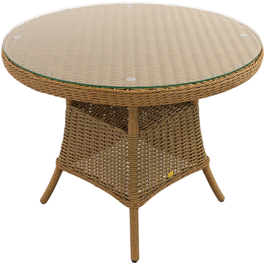 Стол Primo круглой формы рассчитан на комфортное размещение компании людей. Его прочная основа - цельносварной алюминиевый каркас с износостойким порошковым покрытием, дополненный долговечным плетением из искусственного ротанга. Практичная столешница из закаленного стекла легко вписывается в любой интерьер и неприхотлива в уходе.