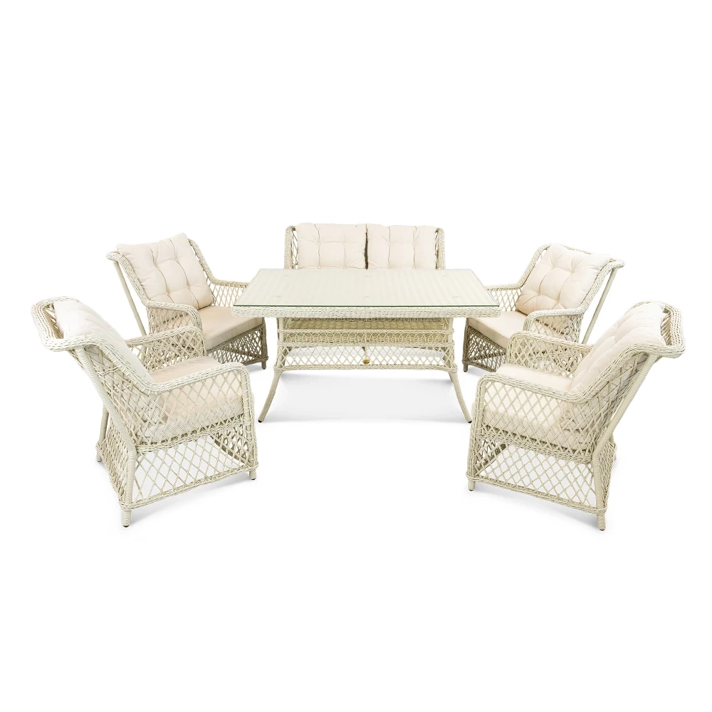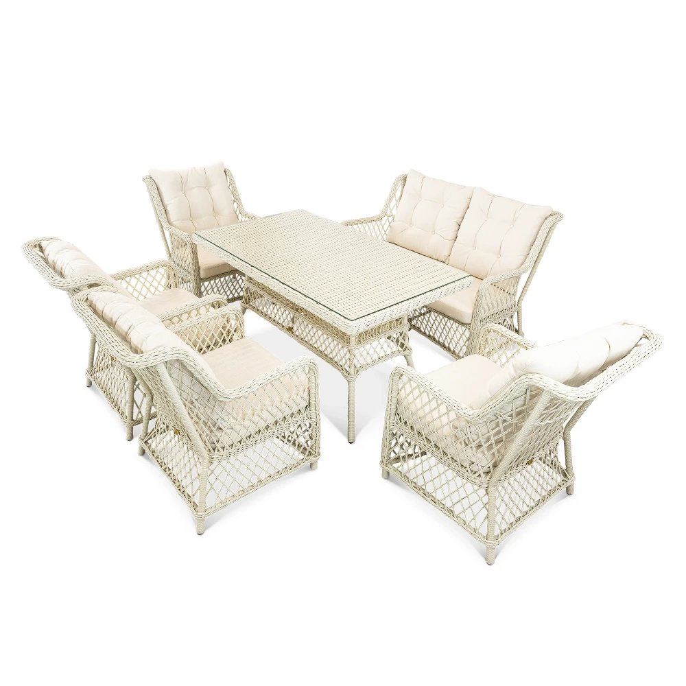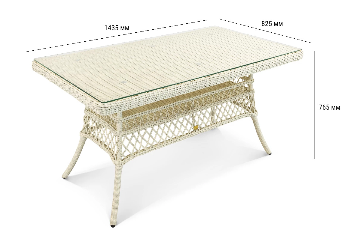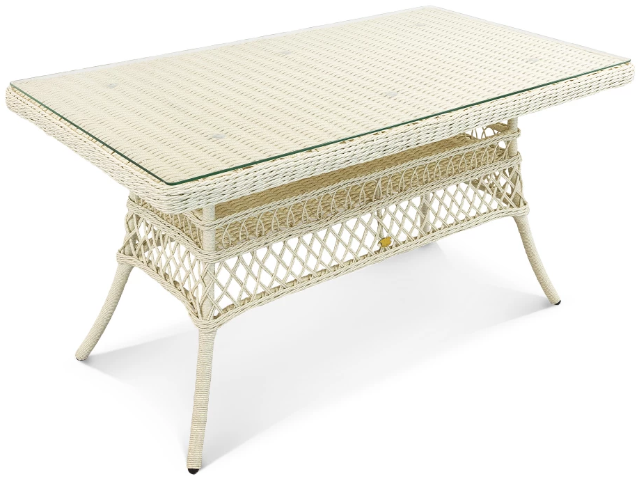 Стол Titulo прямоугольной формы рассчитан на комфортное размещение шести персон. Его прочная основа - цельносварной алюминиевый каркас с износостойким порошковым покрытием, дополненный долговечным плетением из искусственного ротанга. Практичная столешница из закаленного стекла легко вписывается в любой интерьер и неприхотлива в уходе.