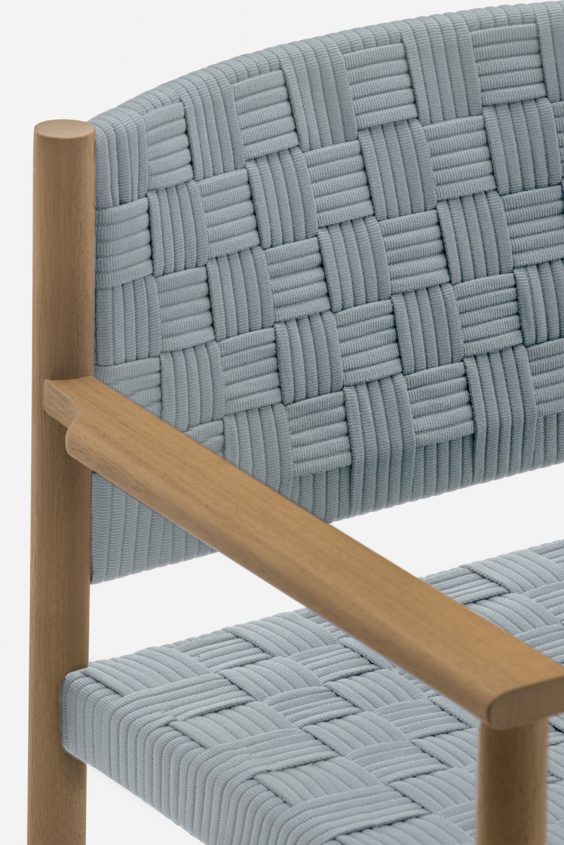 Griante переосмысливает концепцию плетеных сидений с помощью дизайна, сочетающего традиционное мастерство и промышленное производство. Уличное кресло с каркасом из тика - изысканной породы дерева, сертифицированной по стандарту FSC® C114358. Цилиндрические ножки поворачиваются, а алюминиевая рама обеспечивает опору для сиденья.