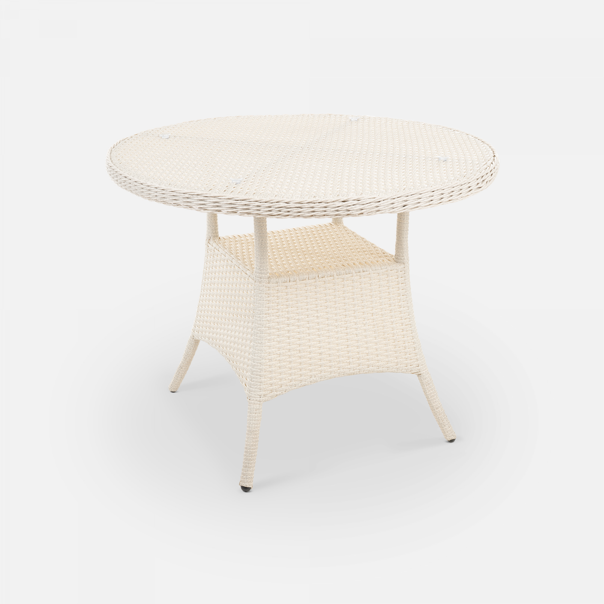 Стол Kipr круглой формы рассчитан на комфортное размещение четырех персон. Его прочная основа - цельносварной алюминиевый каркас с износостойким порошковым покрытием, дополненный долговечным плетением из искусственного ротанга. Практичная столешница из закаленного стекла легко вписывается в любой интерьер и неприхотлива в уходе.