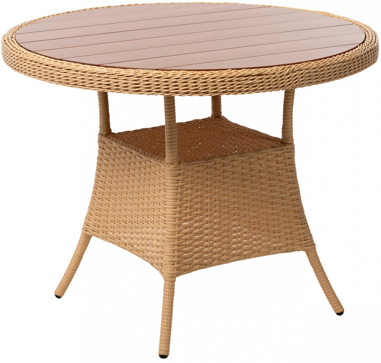 Стол Kipr круглой формы рассчитан на комфортное размещение четырех персон. Его прочная основа - цельносварной алюминиевый каркас с износостойким порошковым покрытием, дополненный долговечным плетением из искусственного ротанга. Практичная столешница из термососны легко вписывается в любой интерьер и неприхотлива в уходе.