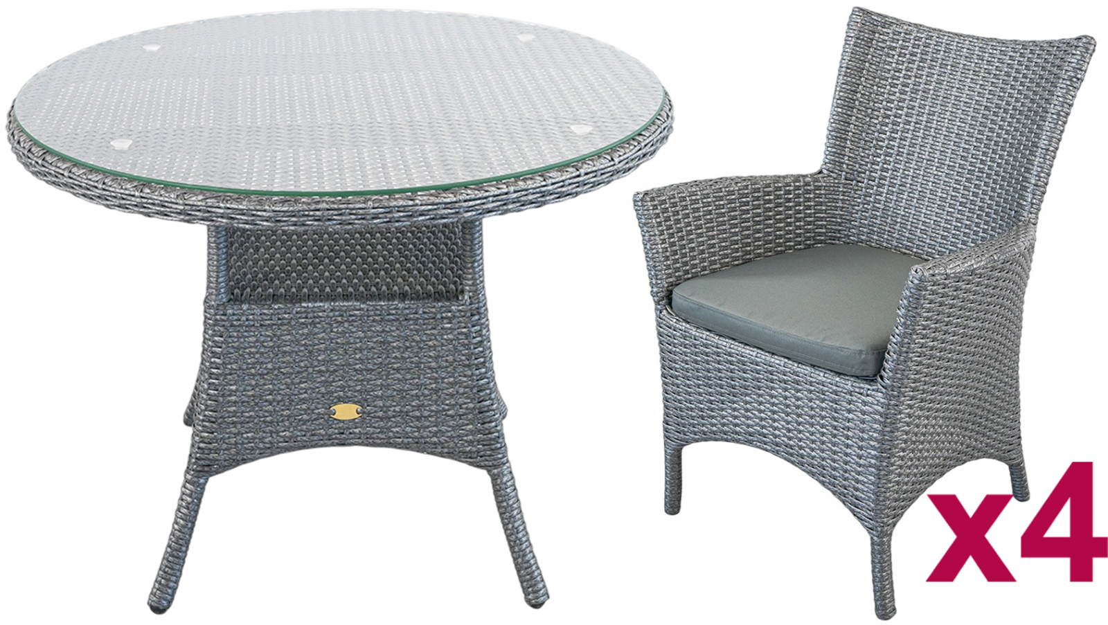 Комфорт и практичность продуманы до мелочей. Круглый стол со столешницей из закаленного стекла создает удобное пространство для четверых человек, оставаясь неприхотливым в уходе. Мягкие кресла с подушками в съемных чехлах из износостойкой ткани обеспечивают максимальное удобство, а возможность быстрой очистки делает комплект идеальным для мест с высокой проходимостью. Набор Kipr - это идеальное решение, которое с равным успехом дополнит частную террасу или патио, а также станет выигрышным выбором для ресторанов, отелей и летних веранд кафе, безупречно служа в течение многих сезонов.