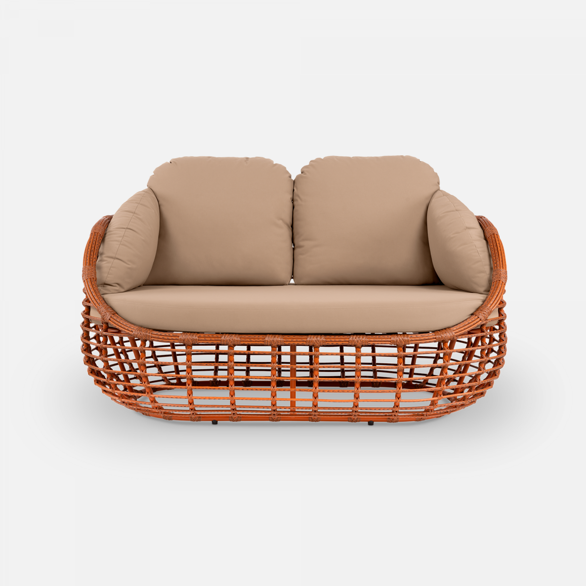 Эргономика дивана обеспечивает комфорт: спинка и подлокотники образуют единую чашу, мягко поддерживающую корпус. Материалы подобраны для долговечности: ротанг не выцветает на солнце, а каркас с порошковой окраской защищен от коррозии. Модель органично вписывается в частные террасы, зоны у бассейна и коммерческие пространства. Преимущества коллекции: глубокая посадка с полной поддержкой спины, устойчивость к влаге и ультрафиолету, простой уход без специальных средств.