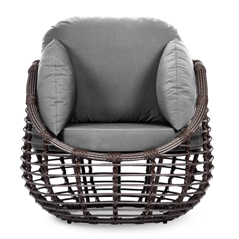 Эргономика кресла обеспечивает комфорт: спинка и подлокотники образуют единую чашу, мягко поддерживающую корпус. Материалы подобраны для долговечности: ротанг не выцветает на солнце, а каркас с порошковой окраской защищен от коррозии. Модель органично вписывается в частные террасы, зоны у бассейна и коммерческие пространства. Преимущества коллекции: глубокая посадка с полной поддержкой спины, устойчивость к влаге и ультрафиолету, простой уход без специальных средств.