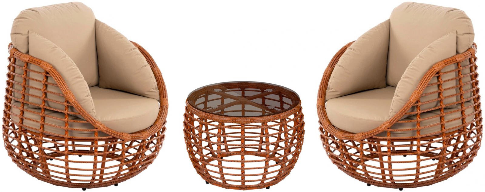 Практичность ансамбля обеспечивается продуманным выбором материалов. Прочные алюминиевые каркасы, устойчивое к погодным условиям плетение и закалённое стекло столешницы гарантируют долговечность и простой уход. Этот сбалансированный комплект - готовое элегантное решение для оформления террасы, патио или зоны отдыха, где каждая деталь подчеркивает единство стиля, комфорта и надёжности.