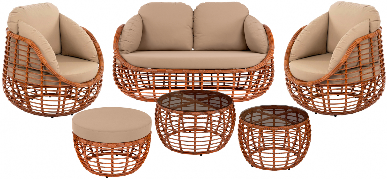 Каждый элемент объединён фирменным дизайном и высочайшим качеством материалов. Прочные алюминиевые каркасы, искусственный ротанг, устойчивый к выцветанию, и практичные ткани гарантируют долговечность и простой уход. Игра текстур - плотное плетение, прозрачное закалённое стекло и мягкие подушки - добавляет интерьеру глубины и тактильного комфорта. Этот комплексный набор - идеальное и готовое решение для создания респектабельной зоны отдыха на просторной террасе, у бассейна или в коммерческом лаунж-пространстве, где важна каждая деталь.