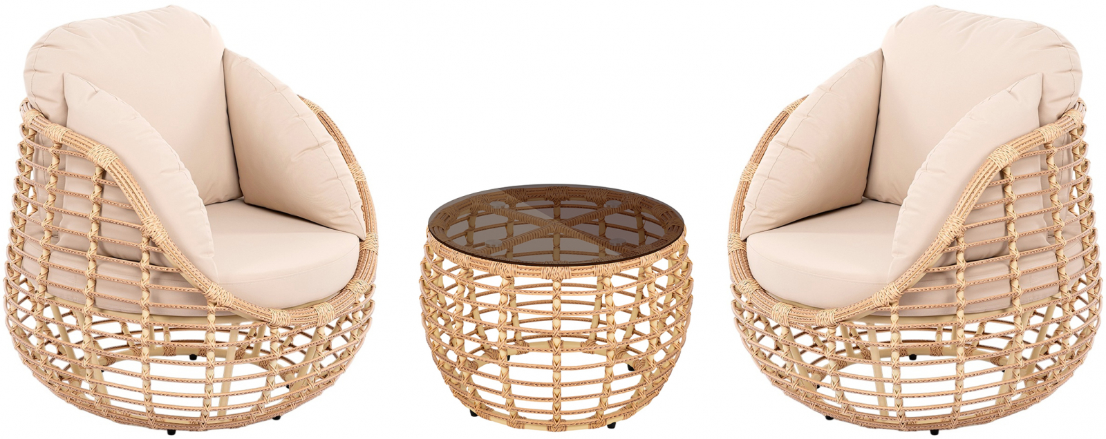 Практичность ансамбля обеспечивается продуманным выбором материалов. Прочные алюминиевые каркасы, устойчивое к погодным условиям плетение и закалённое стекло столешницы гарантируют долговечность и простой уход. Этот сбалансированный комплект - готовое элегантное решение для оформления террасы, патио или зоны отдыха, где каждая деталь подчеркивает единство стиля, комфорта и надёжности.