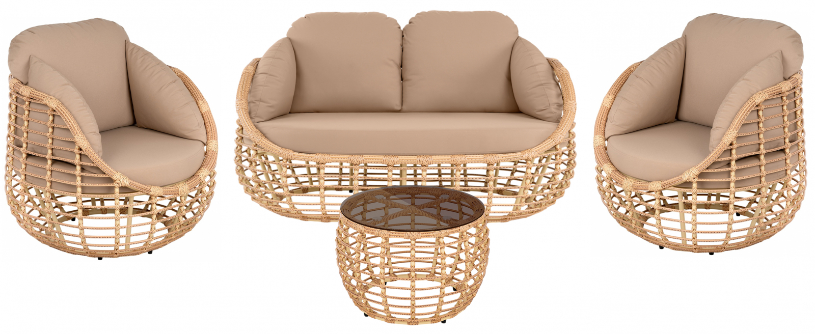 Сформируйте просторную и невероятно уютную зону для отдыха в кругу семьи или друзей с готовым ансамблем Lotus. Композицию задаёт удобный двухместный диван, который в паре с глубокими креслами образует гармоничный полукруг для непринуждённого общения. Каждое место в этой группе - это воплощение комфорта и эргономики, с цельной «чашей» сиденья, обеспечивающей идеальную поддержку. Центральным акцентом служит изящный кофейный столик с ажурным плетением, который объединяет пространство, сохраняя его воздушность и добавляя интерьеру визуальной глубины.