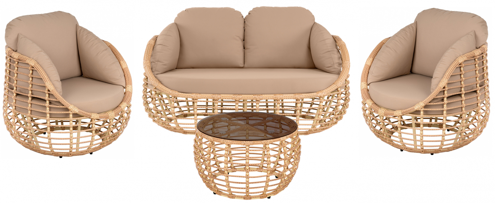 Сформируйте просторную и невероятно уютную зону для отдыха в кругу семьи или друзей с готовым ансамблем Lotus. Композицию задаёт удобный двухместный диван, который в паре с глубокими креслами образует гармоничный полукруг для непринуждённого общения. Каждое место в этой группе - это воплощение комфорта и эргономики, с цельной «чашей» сиденья, обеспечивающей идеальную поддержку. Центральным акцентом служит изящный кофейный столик с ажурным плетением, который объединяет пространство, сохраняя его воздушность и добавляя интерьеру визуальной глубины.