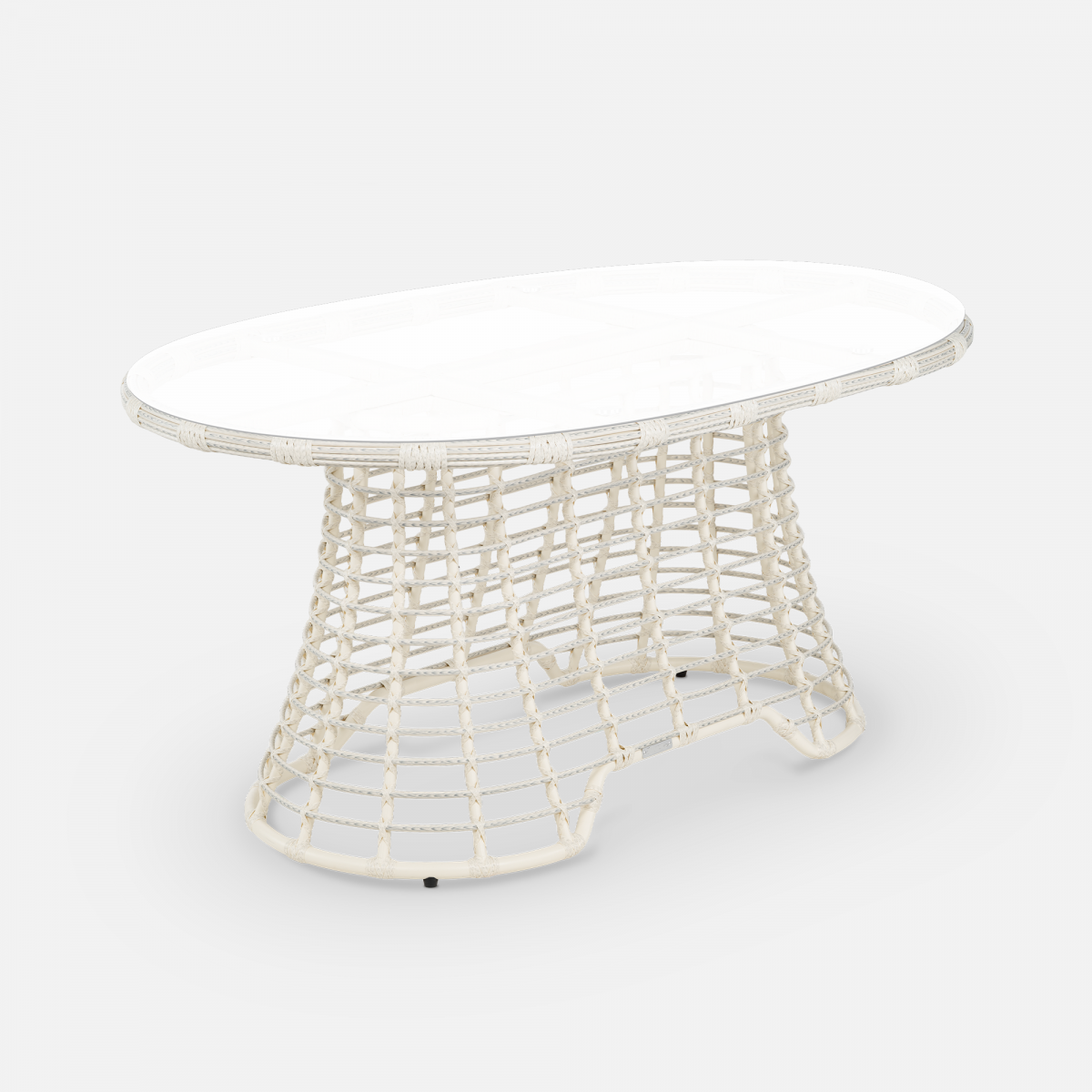Все предметы связаны единым дизайном: плотное плетение искусственного ротанга, прочные алюминиевые каркасы и устойчивые к погодным условиям материалы. Обеденный стол с ажурным основанием и закаленным стеклом дополняет композицию, добавляя визуальной легкости. Комплект создан для долговечной эксплуатации на террасе, в патио или на заднем дворе, предлагая стильное и практичное решение для отдыха на свежем воздухе.
