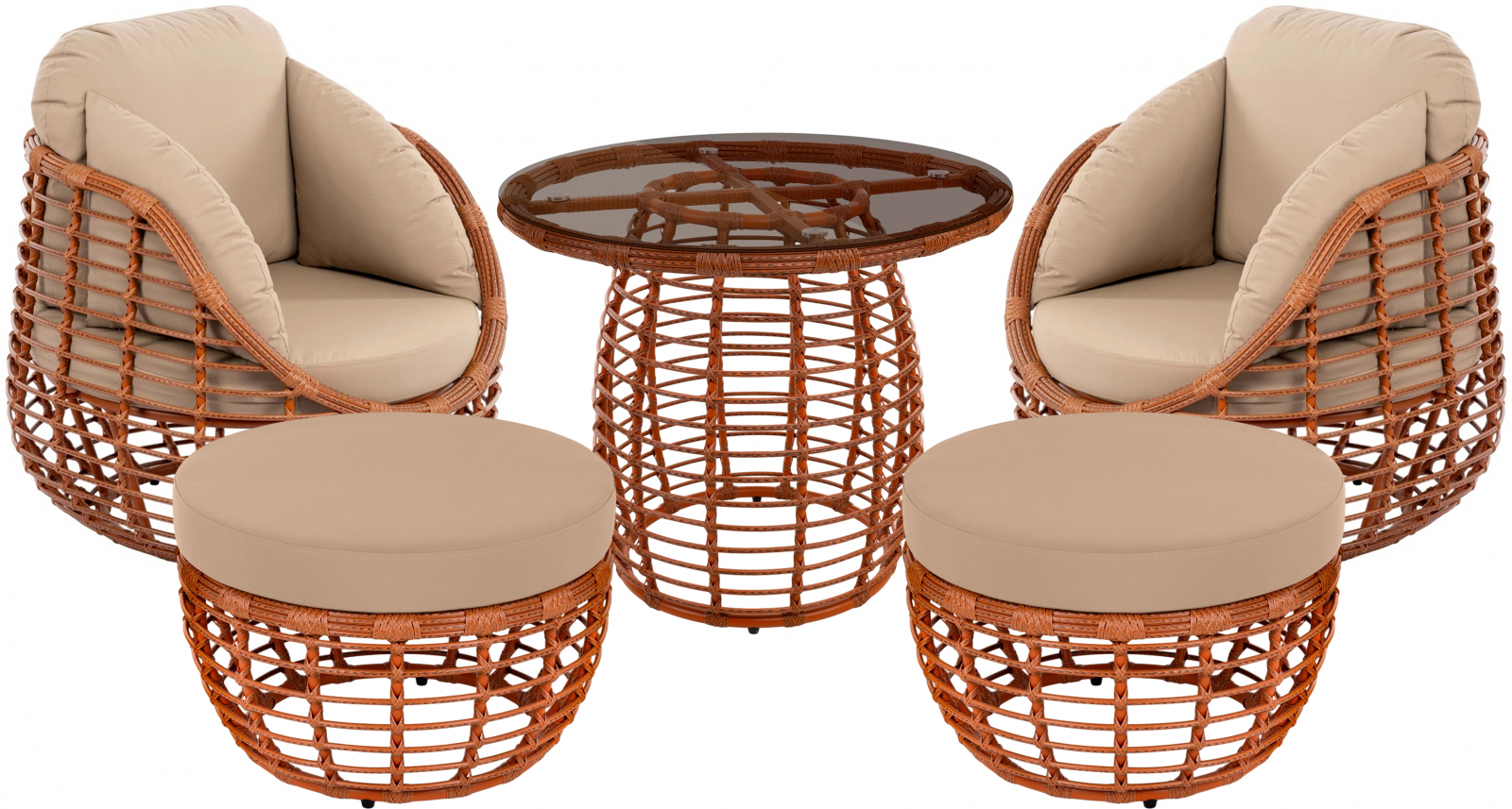 Все предметы связаны единым дизайном: плотное плетение искусственного ротанга, прочные алюминиевые каркасы и устойчивые к погодным условиям материалы. Обеденный стол с ажурным основанием и закаленным стеклом дополняет композицию, добавляя визуальной легкости. Комплект создан для долговечной эксплуатации на террасе, в патио или на заднем дворе, предлагая стильное и практичное решение для отдыха на свежем воздухе.