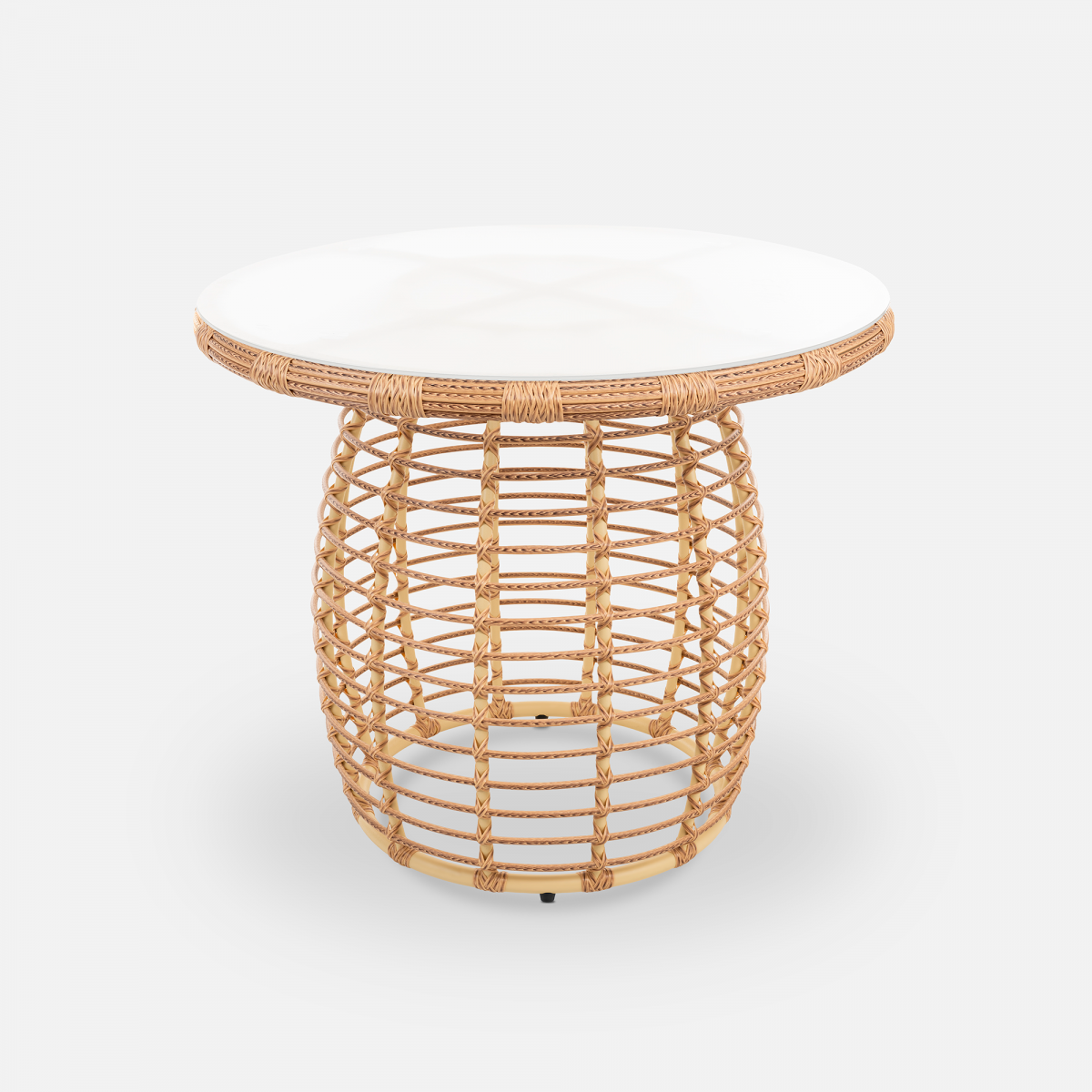 Все предметы связаны единым дизайном: плотное плетение искусственного ротанга, прочные алюминиевые каркасы и устойчивые к погодным условиям материалы. Обеденный стол с ажурным основанием и закаленным стеклом дополняет композицию, добавляя визуальной легкости. Комплект создан для долговечной эксплуатации на террасе, в патио или на заднем дворе, предлагая стильное и практичное решение для отдыха на свежем воздухе.