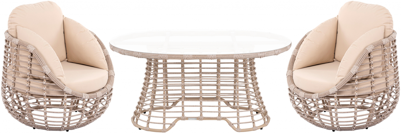 Создайте стильную и комфортную обеденную зону на открытом воздухе с гармоничным комплектом из двух кресел и обеденного стола коллекции Lotus. Ансамбль объединяет глубокую, расслабляющую посадку кресел с выразительным округлым силуэтом и элегантную легкость стола с ажурным плетением под стеклом. Единый дизайн из искусственного ротанга и продуманная эргономика создают визуальное и функциональное единство, идеальное для непринужденных бесед и приемов гостей.