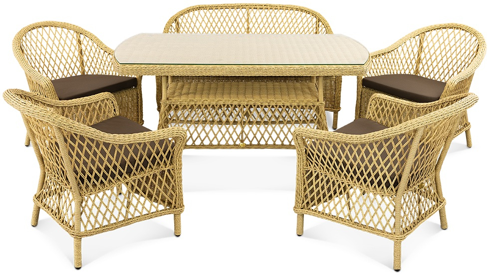 Цена на сайте указана за комплект с плетением в цвете Индийское дерево и обивкой подушек из ткани Calista 4. Для уточнения всех возможных вариантов материала и цвета данного изделия обращайтесь к нашим менеджерам.
