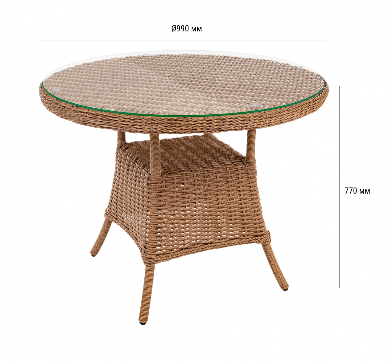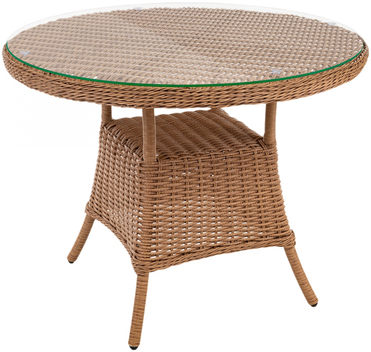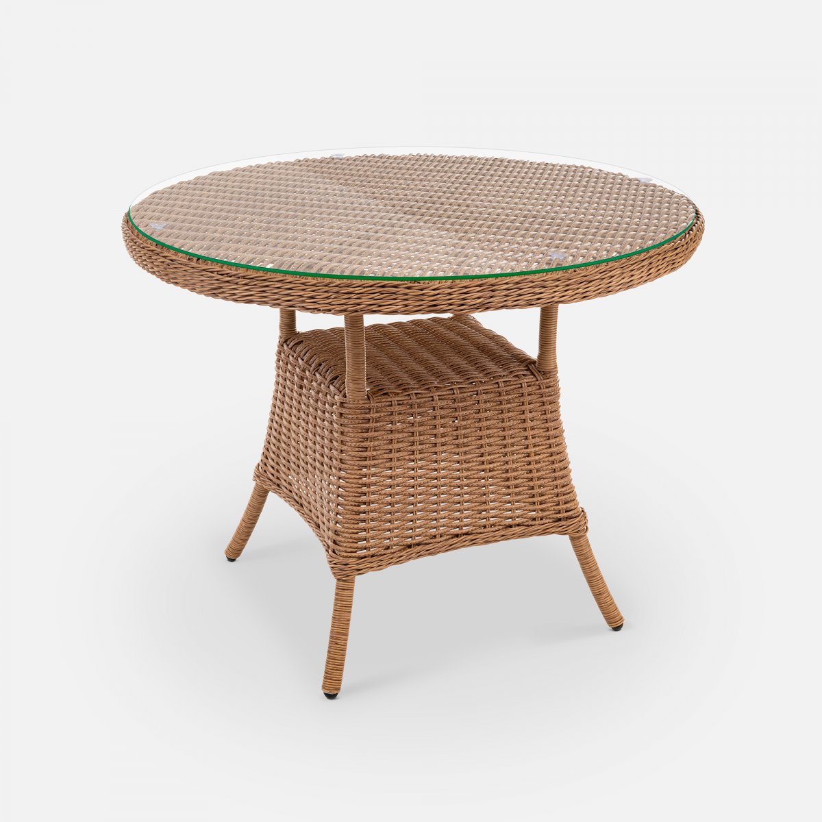 Стол Primo круглой формы рассчитан на комфортное размещение компании людей. Его прочная основа - цельносварной алюминиевый каркас с износостойким порошковым покрытием, дополненный долговечным плетением из искусственного ротанга. Практичная столешница из закаленного стекла легко вписывается в любой интерьер и неприхотлива в уходе.