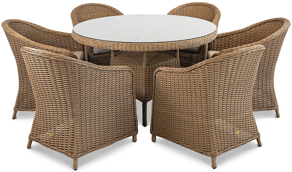 Создайте безупречную обеденную зону на открытом воздухе с гарнитуром Primo, который сочетает в себе эталонную прочность, современную эстетику и исключительный комфорт для шести персон. В основе комплекта лежит цельносварной алюминиевый каркас с антикоррозийным порошковым напылением, гарантирующий абсолютную устойчивость к любым погодным условиям - от палящего солнца до дождя и перепадов температур. Элегантное плетение из искусственного ротанга, не выцветающего со временем, формирует изящные спинки и сиденья кресел, а также обрамление круглого стола, создавая гармоничный и завершенный ансамбль.