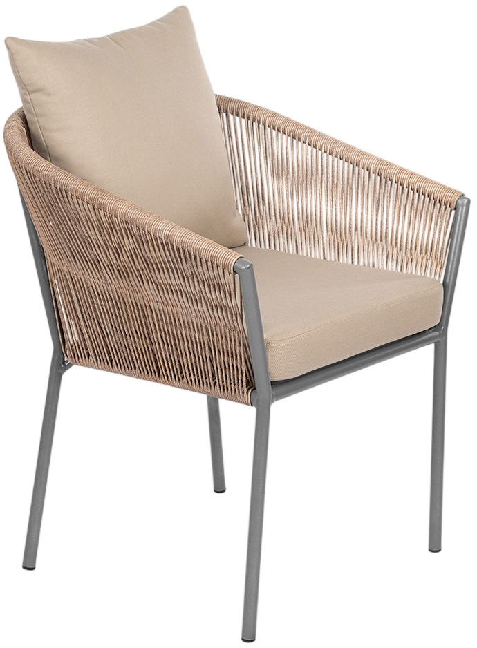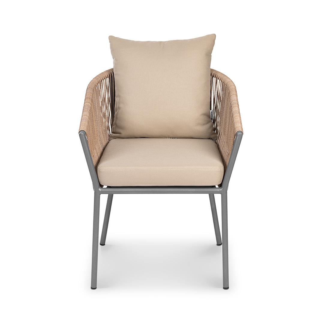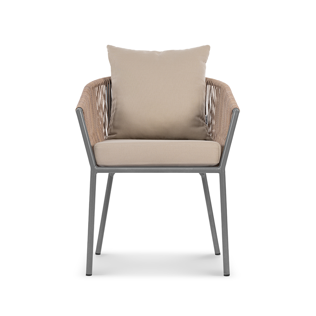 Коллекция Patio воплощает искусство создания уютного и элегантного пространства под открытым небом. Еe обеденное кресло, с его легким силуэтом и тонкими линиями, визуально расширяет границы террасы, наполняя еe ощущением воздушности и безмятежного отдыха. В основе дизайна - гармоничный синтез материалов: прочный цельносварной алюминиевый каркас, аккуратное плетение из стойкого искусственного ротанга и мягкие подушки из практичной уличной ткани. Полупрозрачный, ажурный контур, подчeркнутый тeмным металлом, создаёт аккуратную и современную композицию даже в компактных зонах.