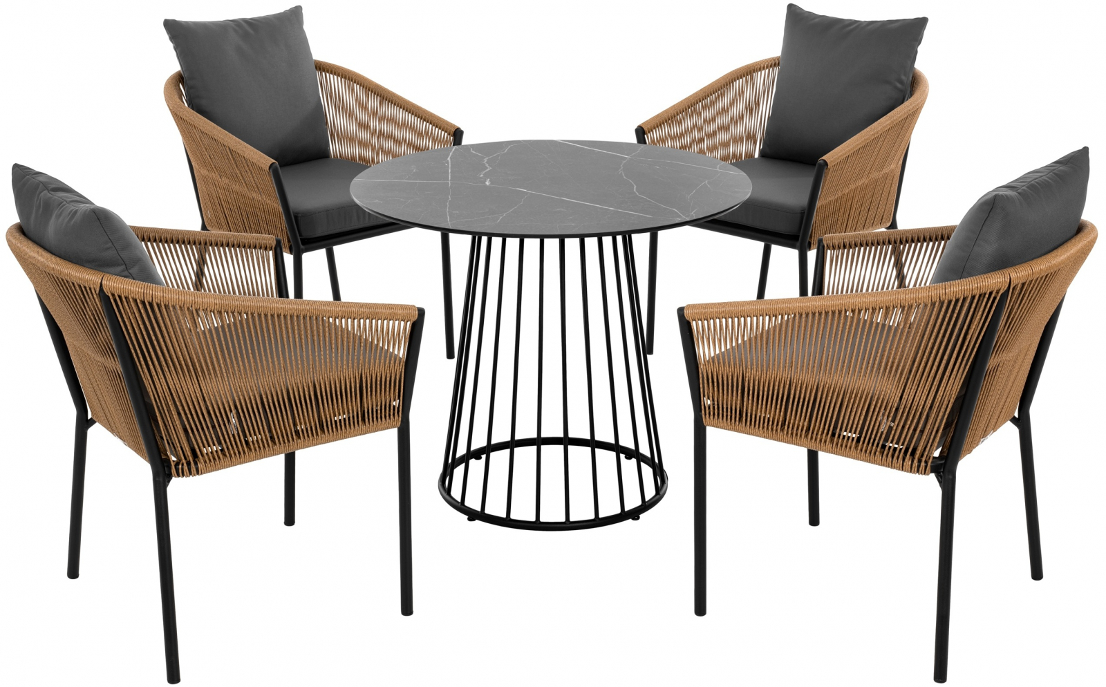 Обеденный комплект Patio представляет собой гармоничный ансамбль, создающий идеальную среду для отдыха на открытом воздухе. Легкий круглый стол с ажурной алюминиевой опорой и тонкой столешницей служит стильным центром композиции. Его окружают четыре эргономичных кресла, чьи воздушные силуэты с плетением из искусственного ротанга перекликаются с общей эстетикой легкости и порядка. Набор формирует сбалансированное и уютное пространство для приятного общения.