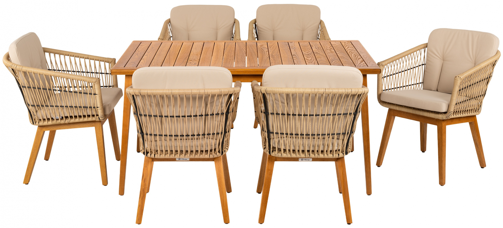 Комплект отличается выдающейся практичностью. Прочная конструкция из алюминия и ясеня обеспечивает долговечность, а износостойкие подушки и легкоочищаемое плетение сводят уход к минимуму. Продуманная эргономика гарантирует комфорт, а универсальная эстетика делает ансамбль уместным как в частном интерьере, так и в заведениях сегмента HoReCa.