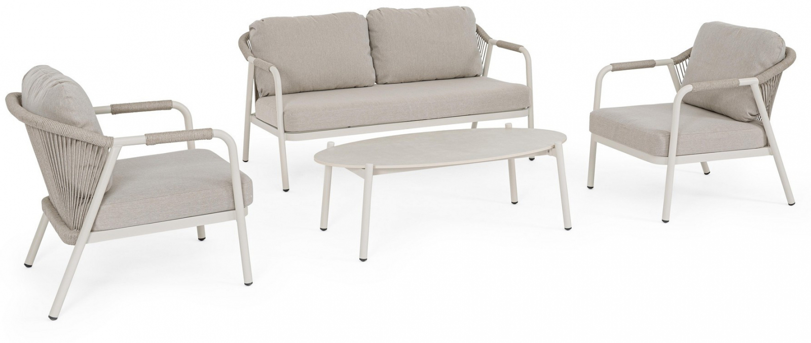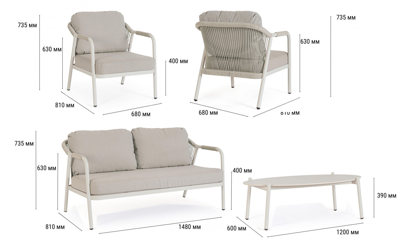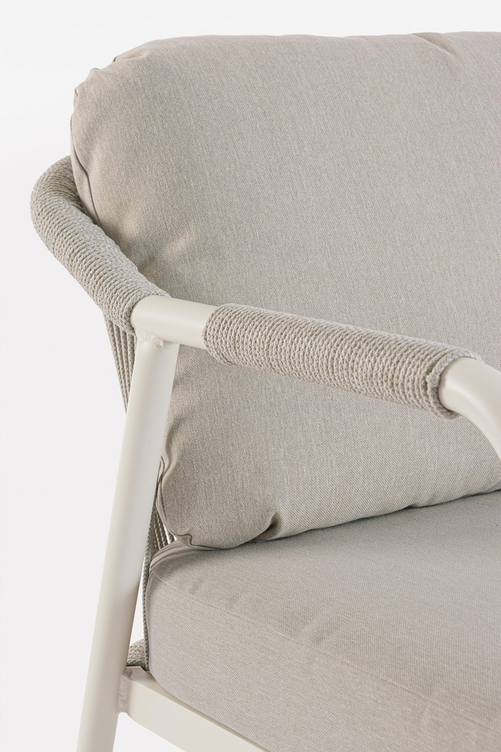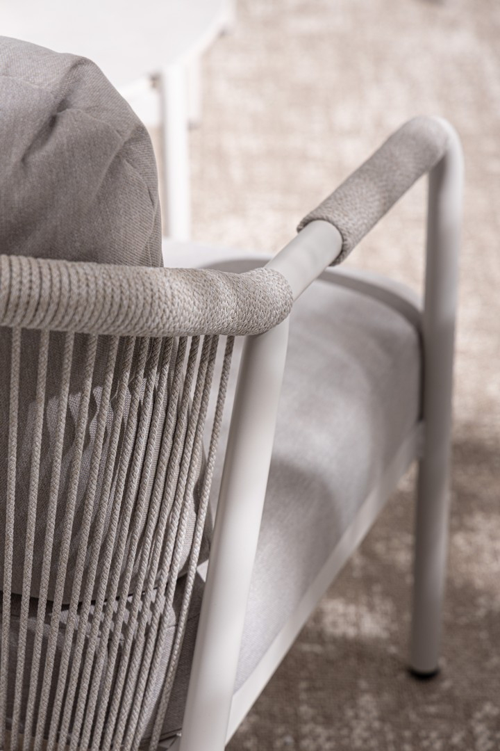 Miravet – комплект лаунж мебели из высококачественных материалов. Изысканная конструкция из алюминия с высокопрочным полиэстерным порошковым покрытием гарантирует исключительную прочность и устойчивость к непогоде. Плетеные элементы из роупа, придают комплекту неповторимый шарм и легкость. А благодаря лаконичному и элегантному дизайну он с легкостью вписывается в разнообразные стили площадок, придавая им современный, но в то же время теплый характер.