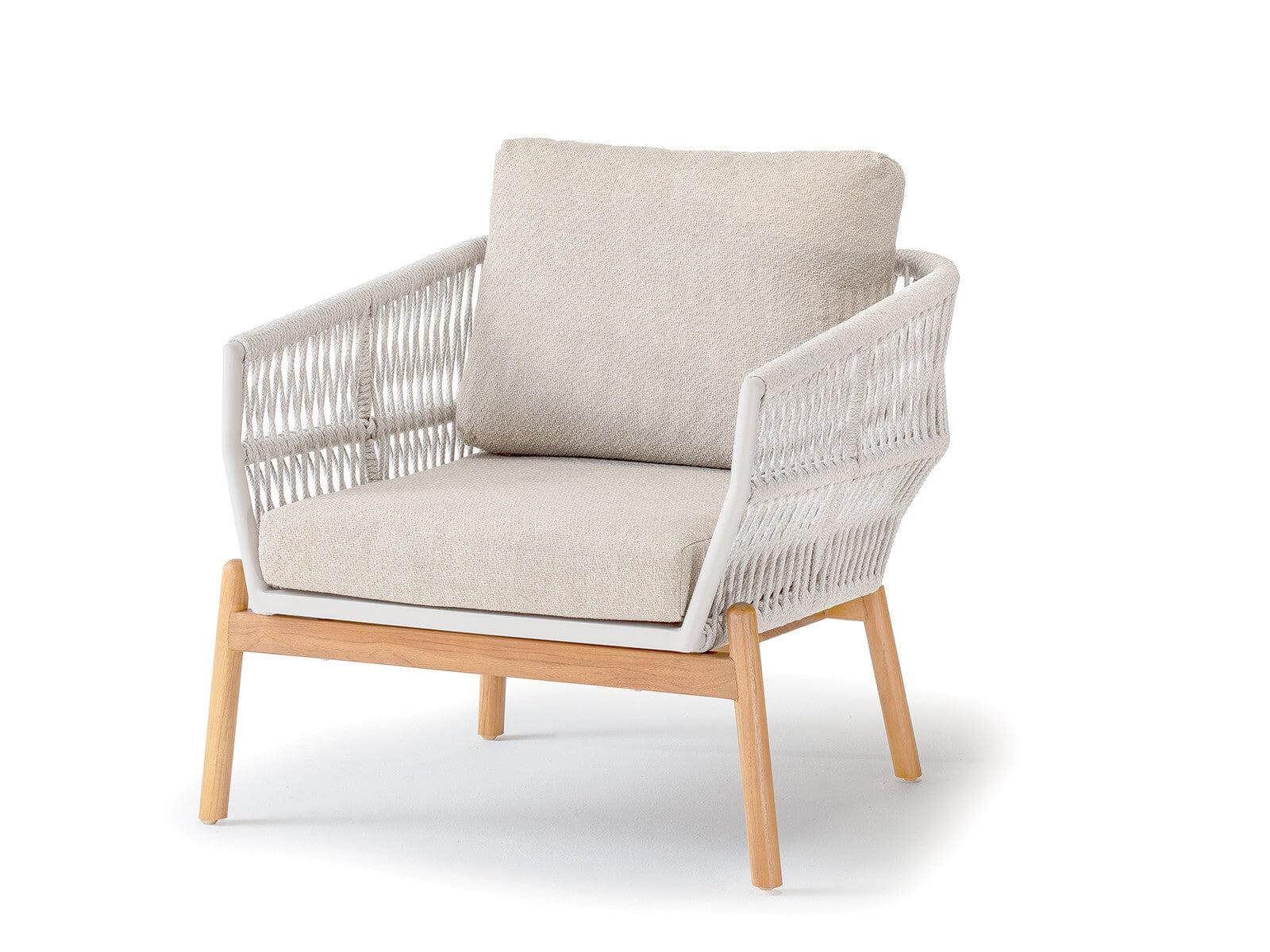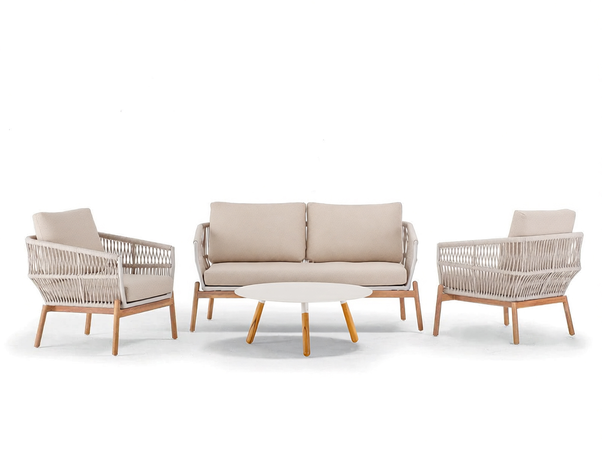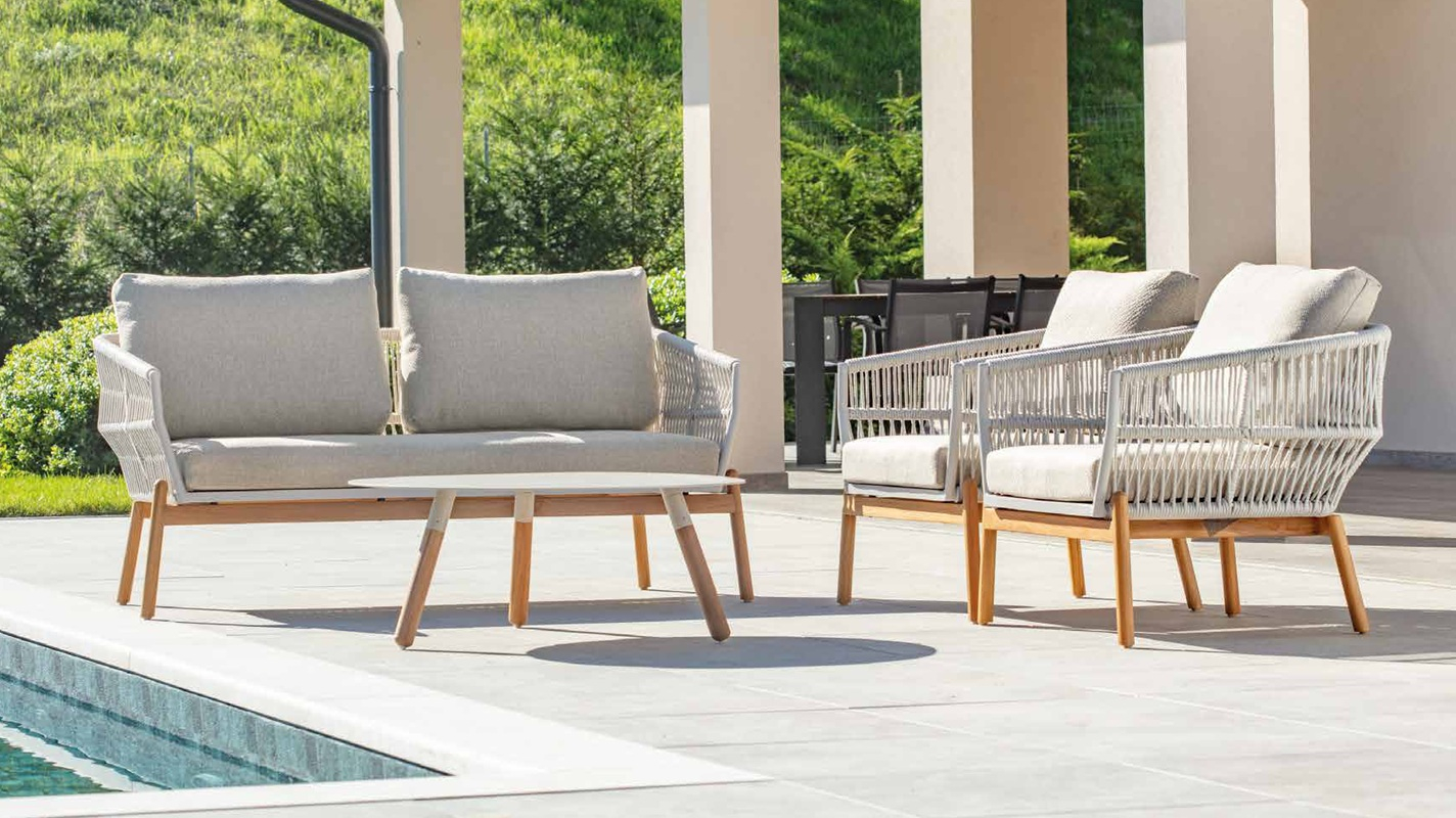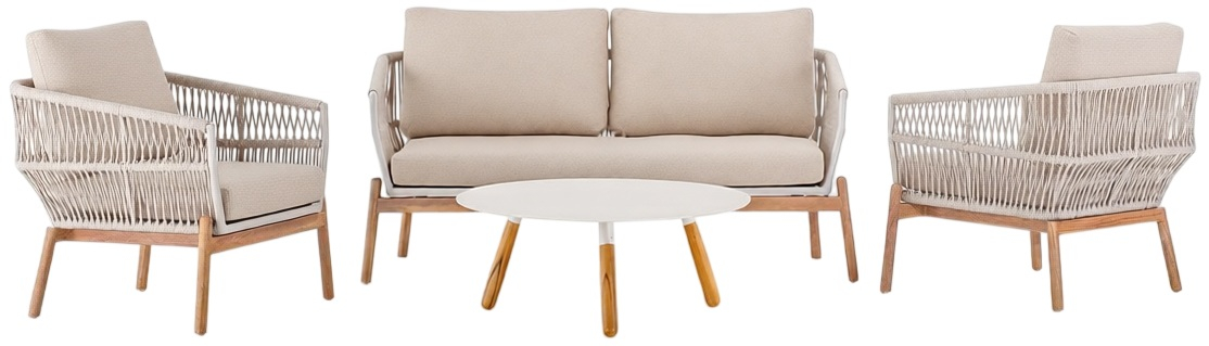 Садовый комплект для отдыха Alicante сочетает в себе современный дизайн, высокий комфорт и долговечность материалов. Он состоит из двух кресел, двухместного дивана и журнального столика с алюминиевой столешницей и идеально подходит для стильных открытых пространств. Каркас выполнен из тика, рама корпуса изготовлена из алюминия и обтянута полиолефиновым канатом толщиной 9 мм. Подушки из олефина с быстросохнущим пеноматериалом обеспечивают максимальный комфорт.
