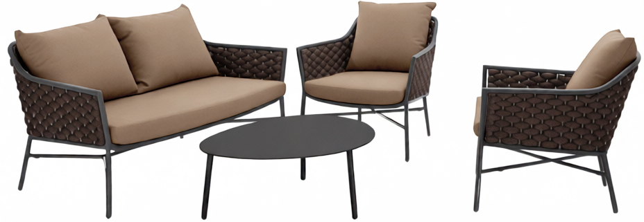 Комплект Panama состоит из двухместного дивана, двух кресел и журнального столика. Устойчивый и надежный каркас из алюминия кресел и дивана оплетен текстиленовым и резиновым канатом. Подушки из текстилена обеспечивают дополнительный комфорт. Журнальный столик выполнен из алюминия. Стильный и удобный комплект можно разместить в зоне отдыха в помещении или на открытом воздухе.