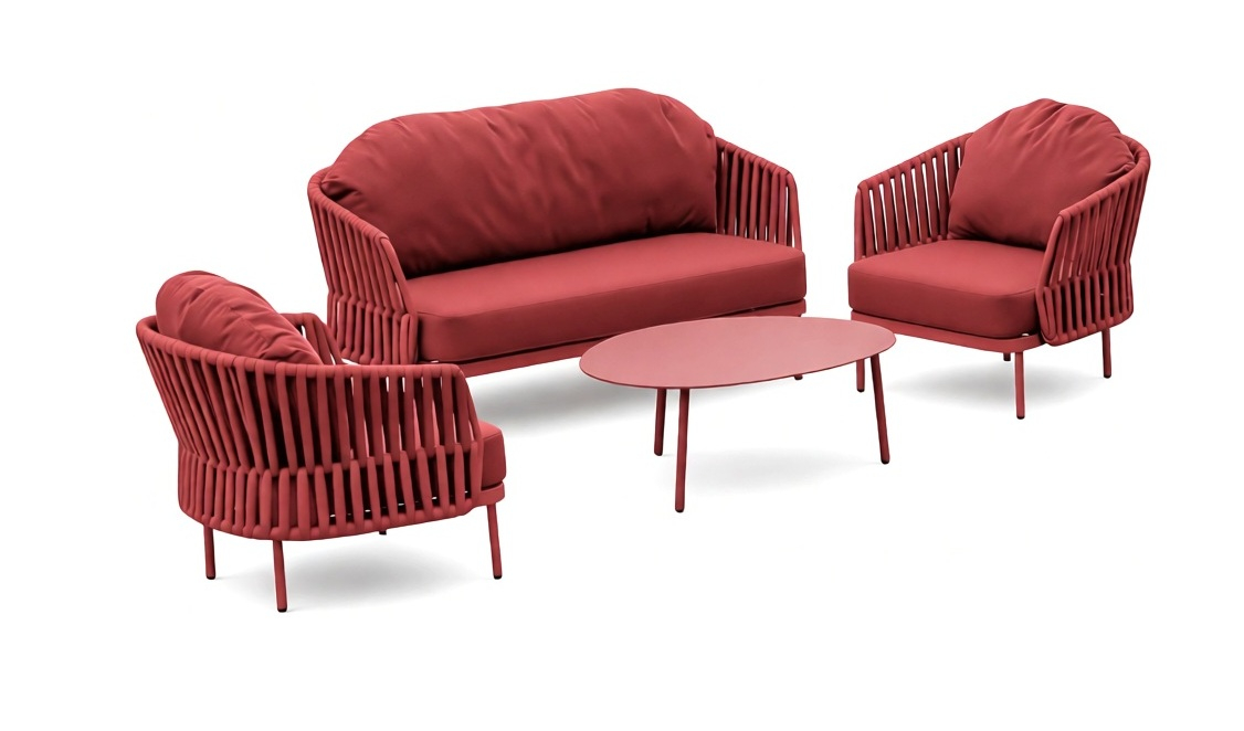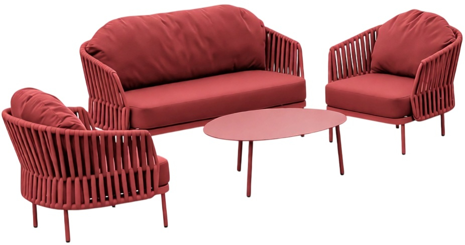 Уличный комплект Soho состоит из двухместного дивана, двух кресел и журнального столика со столешницей из алюминия. Алюминиевый каркас оплетен роупом (полиэстер и резина), мягкие подушки на сиденьях и спинках со съемными чехлами из олефина, устойчивого к загрязнениям и ультрафиолетовому излучению.