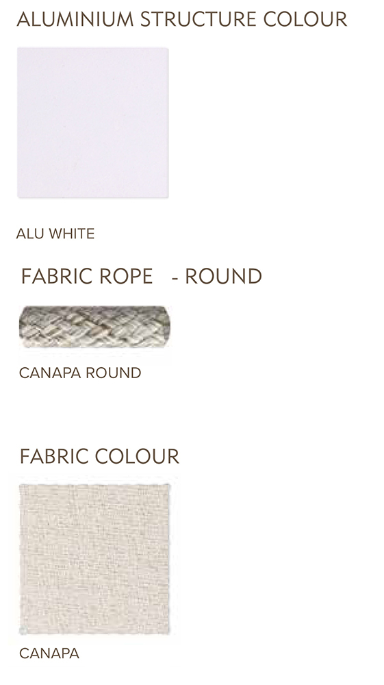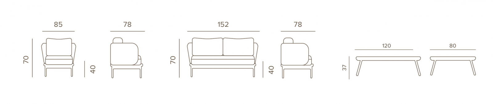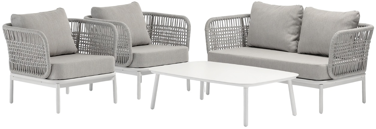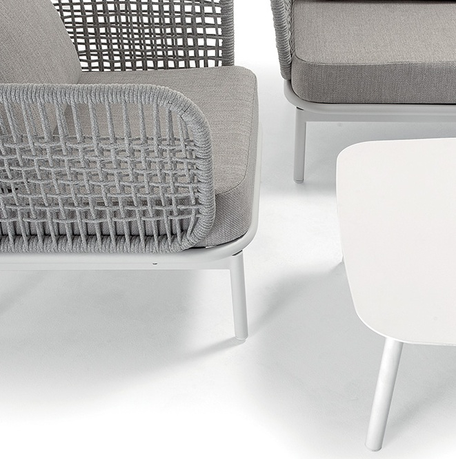 Уличный комплект Yolk включает двухместный диван, два кресла и журнальный столик с алюминиевой столешницей. Каркас из алюминия оплетён прочным роупом диаметром 6 мм (полиэстер), а сиденья и спинки оснащены мягкими подушками с легко снимаемыми чехлами из олефиновой ткани, устойчивой к загрязнениям и воздействию ультрафиолета.