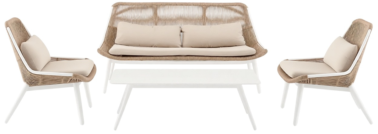 Комплект Como - это двухместный диван, два кресла и низкий столик из алюминия. Плетение дивана и кресел выполнено из искусственного ротанга. Подушки на сиденьях и спинках выполнены из олефина - материала, устойчивого к пятнам и ультрафиолетовому излучению. Такой комплект будет уместен как в частных зонах отдыха, так и на террасах отелей, кафе и баров.