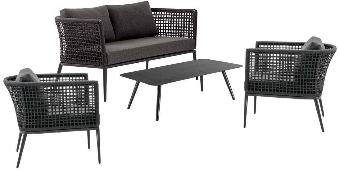 Комплект Cuba состоит из двухместного дивана, двух кресел и журнального столика, каркас которых выполнен из алюминия с порошковым покрытием. Кресла и диван имеют низкую спинку, которая создает одно целое с подлокотниками благодаря канатному плетению из полиэстера Ø6 мм. Объемные и мягкие подушки, созданные для максимизации комфорта, выполнены из олефина, устойчивого к пятнам и ультрафиолетовому излучению. Коллекция Cuba идеально подходит для тех, кто хочет произвести впечатление с помощью дизайнерской мебели в интерьере и на открытых площадках.