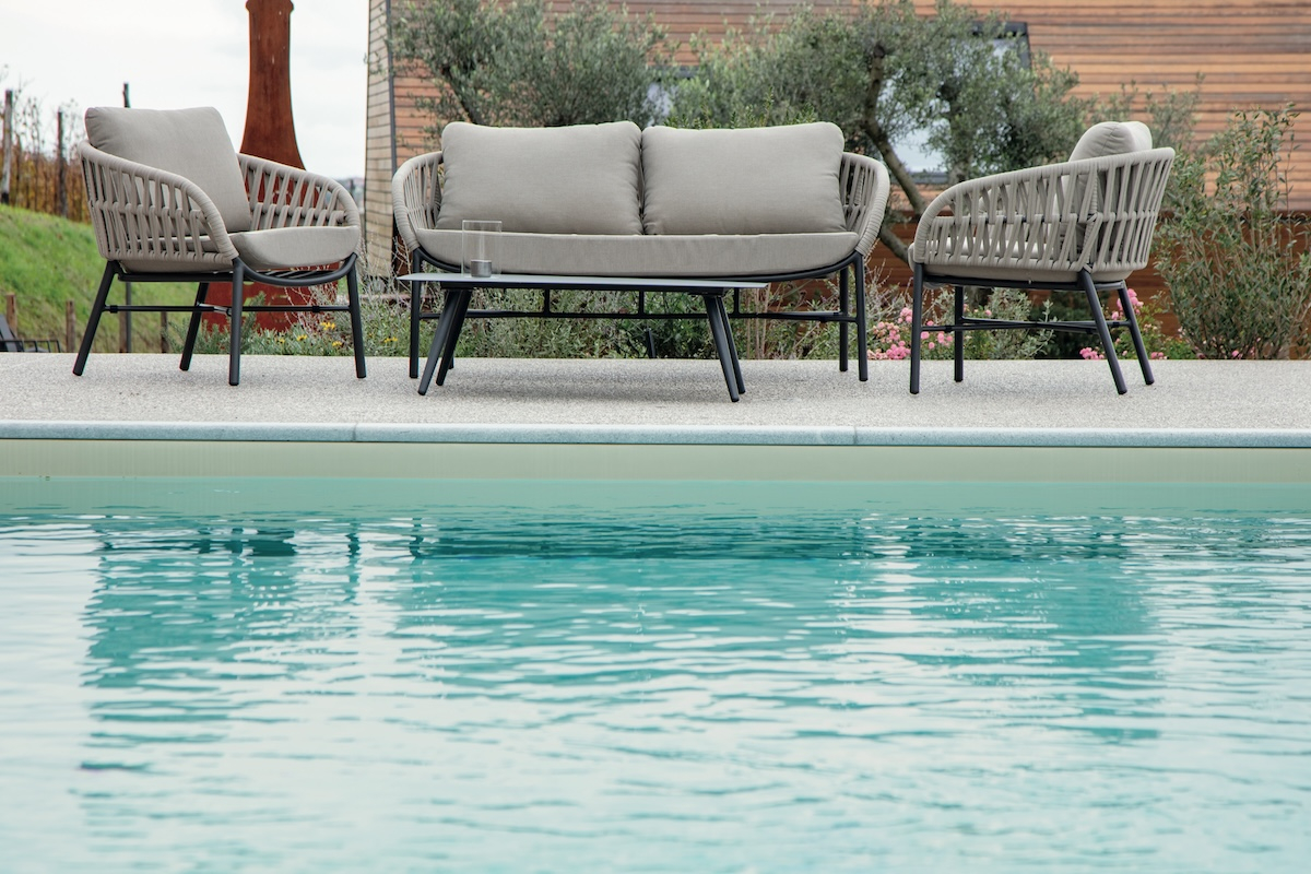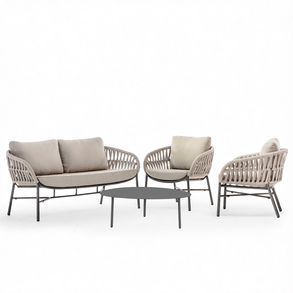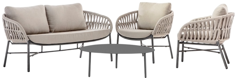 Tahiti - это современный садовый комплект, который создает открытую зону отдыха, подходящую для четырех человек, состоящий из двухместного дивана, двух кресел и журнального столика. Мебель имеет алюминиевый каркас с порошковым покрытием. Диван и кресла дополняются переплетением из каната из полиэстера толщиной 6 мм и подушками на сиденье и спинке. Чехлы на подушках выполнены из олефина, устойчивого к воздействию ультрафиолетовых лучей и плесени. Журнальный столик Island Big выполнен из алюминия. Столешница - алюминиевый лист толщиной 5 мм.