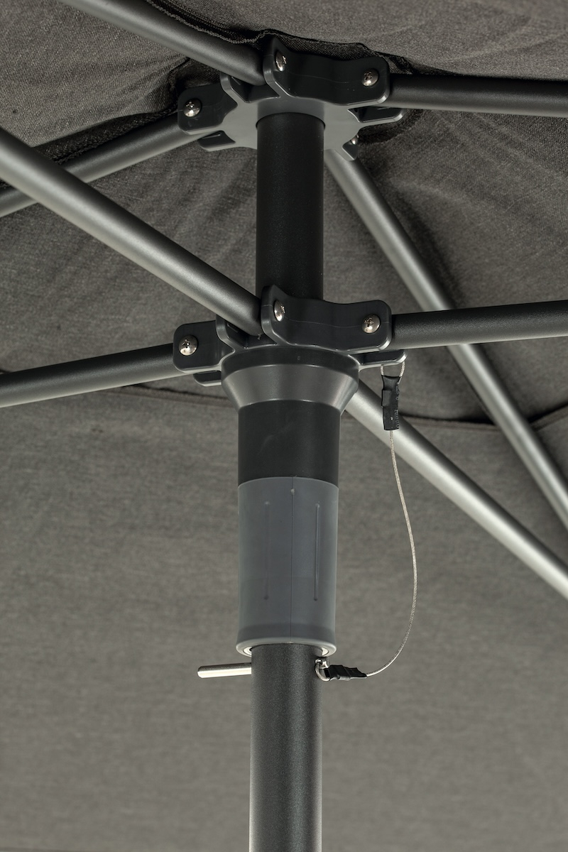 Зонт Cocoa с алюминиевой центральной опорой имеет удачный дизайн и идеально подходит для небольших помещений, таких как балконы и бассейны. Его конструкция делает его очень удобным в использовании. Прочная цельная опора диаметром 38 мм обеспечивает устойчивость и достаточно крепка, чтобы выдерживать ветер силой до 8 баллов. Купол выполнен из олефина.