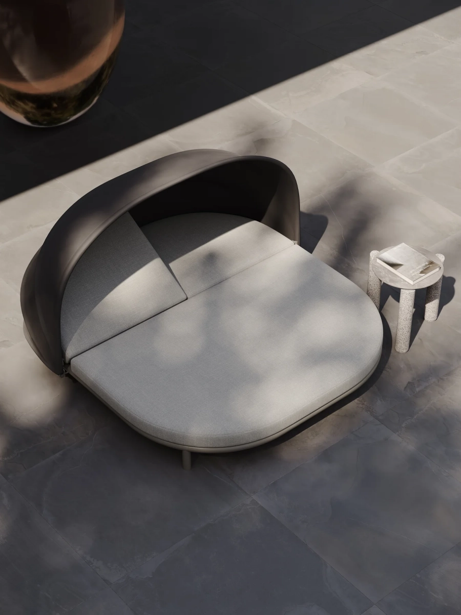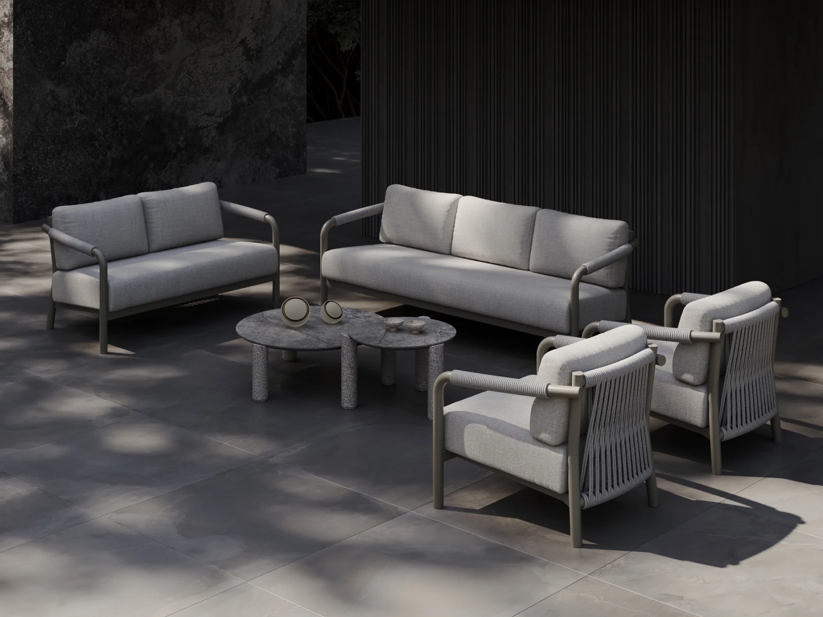 Коллекция включает в себя кресло, двухместный и трехместный диваны, журнальный столик, шезлонг и кушетку, образуя полноценный комплект мебели для отдыха на открытом воздухе, выдержанный в едином стиле. Обеденный гарнитур продолжает эту концепцию благодаря тому же структурированному алюминиевому каркасу, обеспечивая визуальную гармонию всех типов мебели.