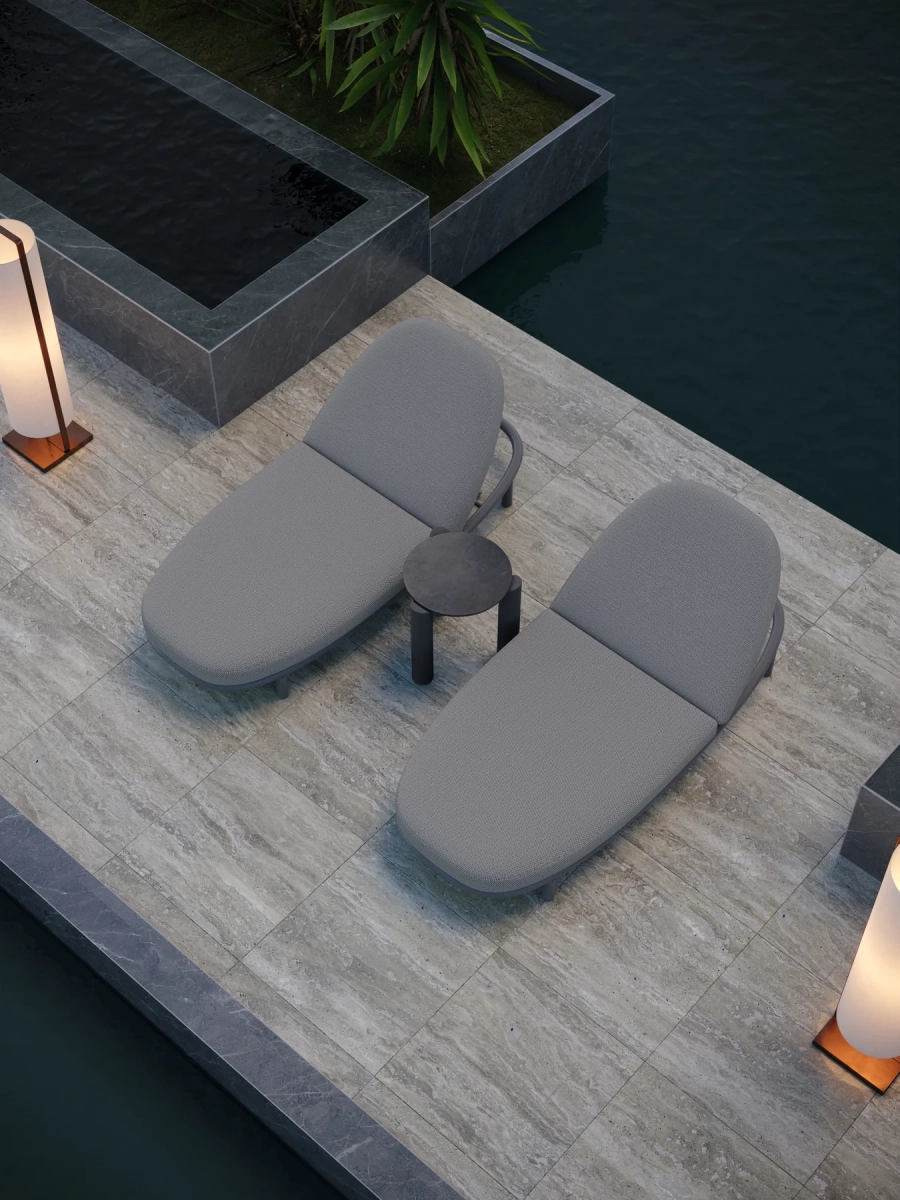 Коллекция включает в себя кресло, двухместный и трехместный диваны, журнальный столик, шезлонг и кушетку, образуя полноценный комплект мебели для отдыха на открытом воздухе, выдержанный в едином стиле. Обеденный гарнитур продолжает эту концепцию благодаря тому же структурированному алюминиевому каркасу, обеспечивая визуальную гармонию всех типов мебели.