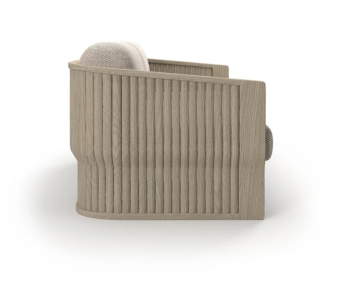 Двухместный диван Elythia объединяет мягкие линии и тактильную текстуру натурального тика с изящными деталями из вручную сплетеной акриловой веревки (роуп). Поверхности с имитацией камня создают визуальный контраст и ощущение естественного покоя, а мягкие линии сидений и спинок обеспечивают комфорт и уют в любой зоне отдыха: от веранды до открытой террасы.