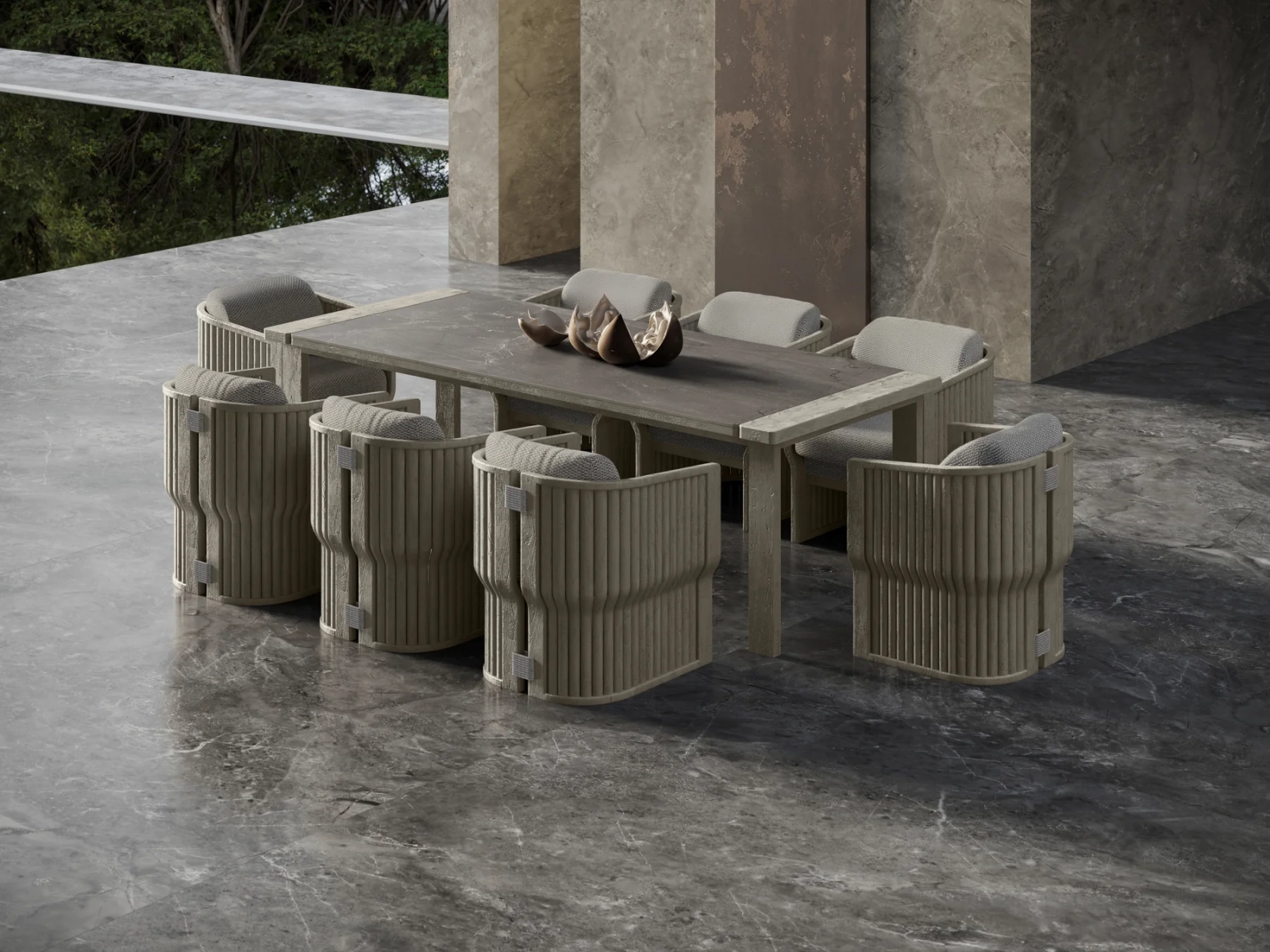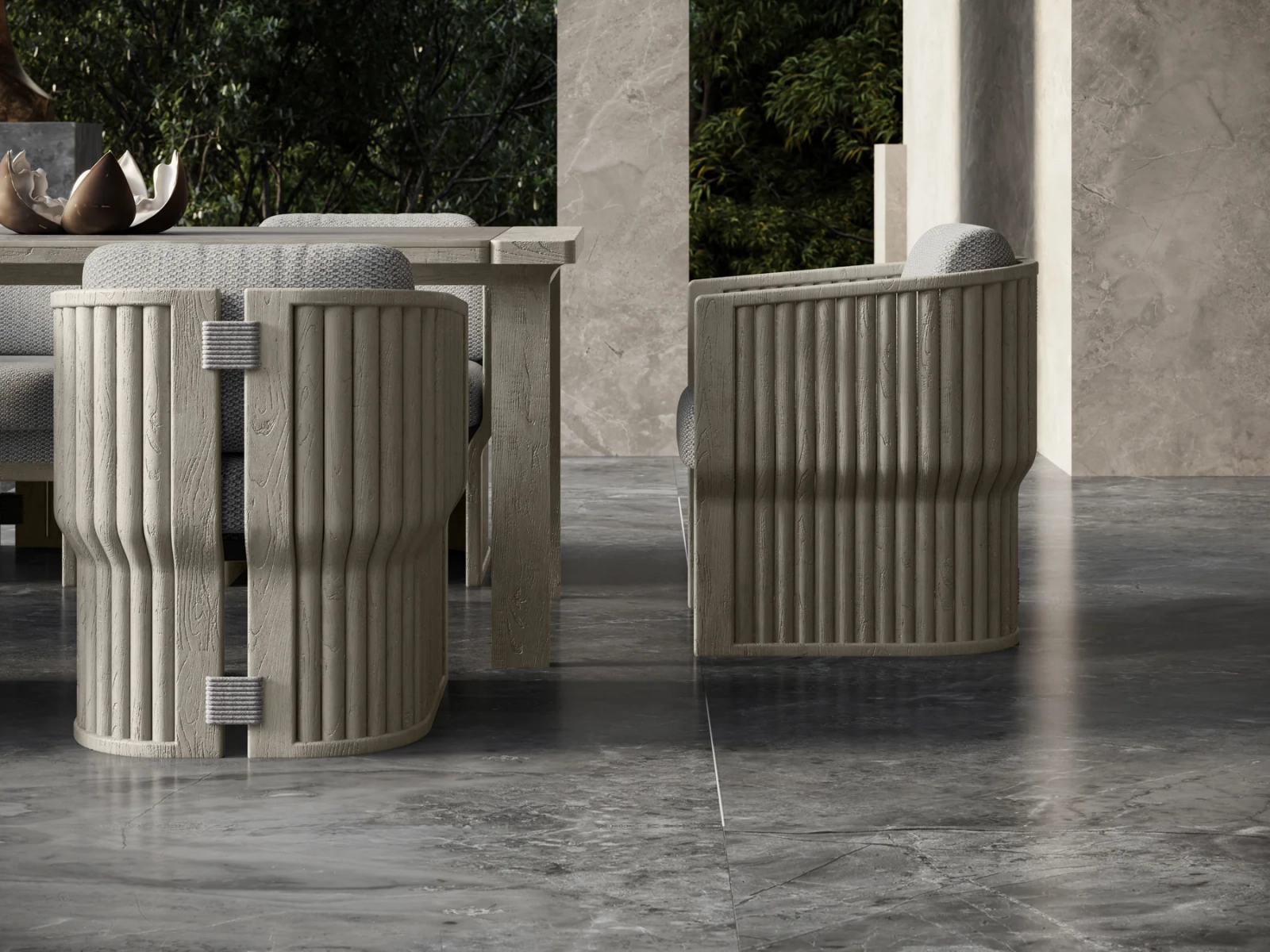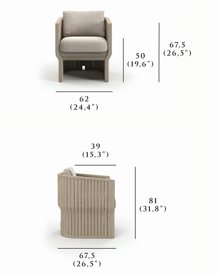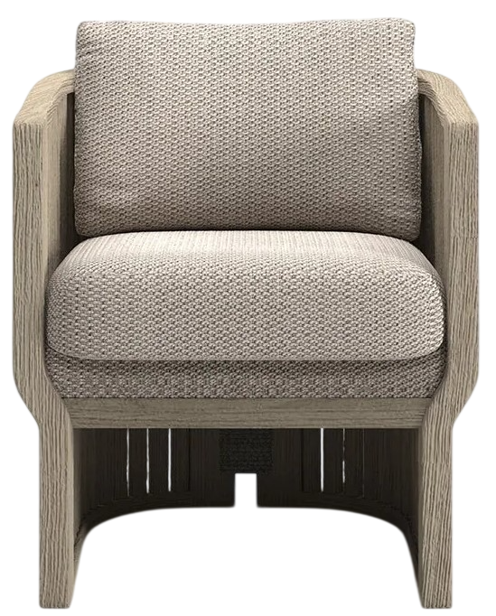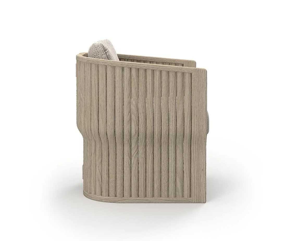 Кресло Elythia объединяет мягкие линии и тактильную текстуру натурального тика с изящными деталями из вручную сплетеной акриловой веревки (роуп). Поверхности с имитацией камня создают визуальный контраст и ощущение естественного покоя, а мягкие линии сидений и спинок обеспечивают комфорт и уют в любой зоне отдыха: от веранды до открытой террасы.
