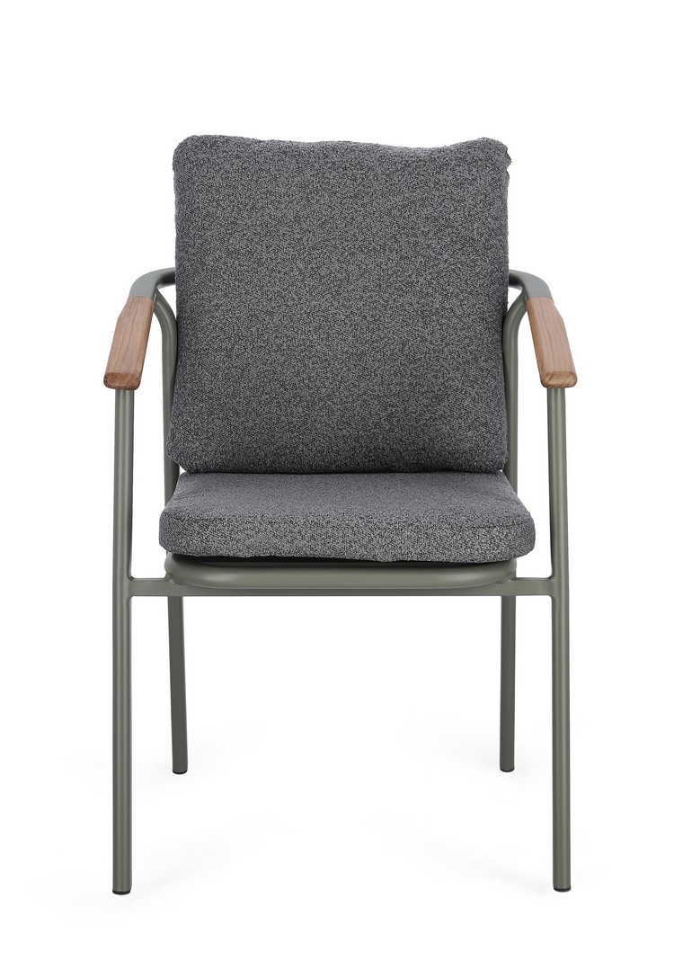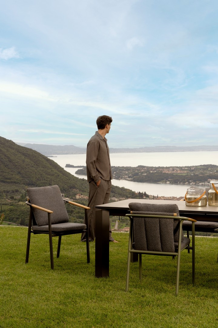 Leonida - элегантное кресло, в котором современный минимализм встречается с природным теплом. Основой модели служит прочный каркас из алюминия с долговечным порошковым покрытием, дополненный изысканными вставками из натурального тикового дерева на подлокотниках и спинке. Особую текстуру и уют интерьеру придает обивка из инновационной водоотталкивающей олефиновой ткани с актуальным эффектом букле. Съемные мягкие подушки, выполненные из того же материала, обеспечивают максимальный комфорт для гостей и простоту в обслуживании.